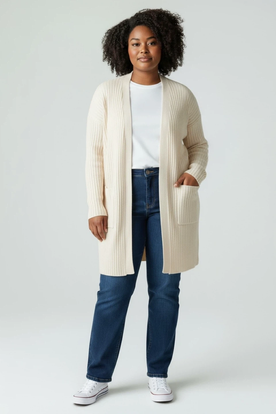 A cozy cream-coloured knit cardigan! Perfect for layering on those cooler days. It has a relaxed fit and two handy pockets. A great addition to any wardrobe!