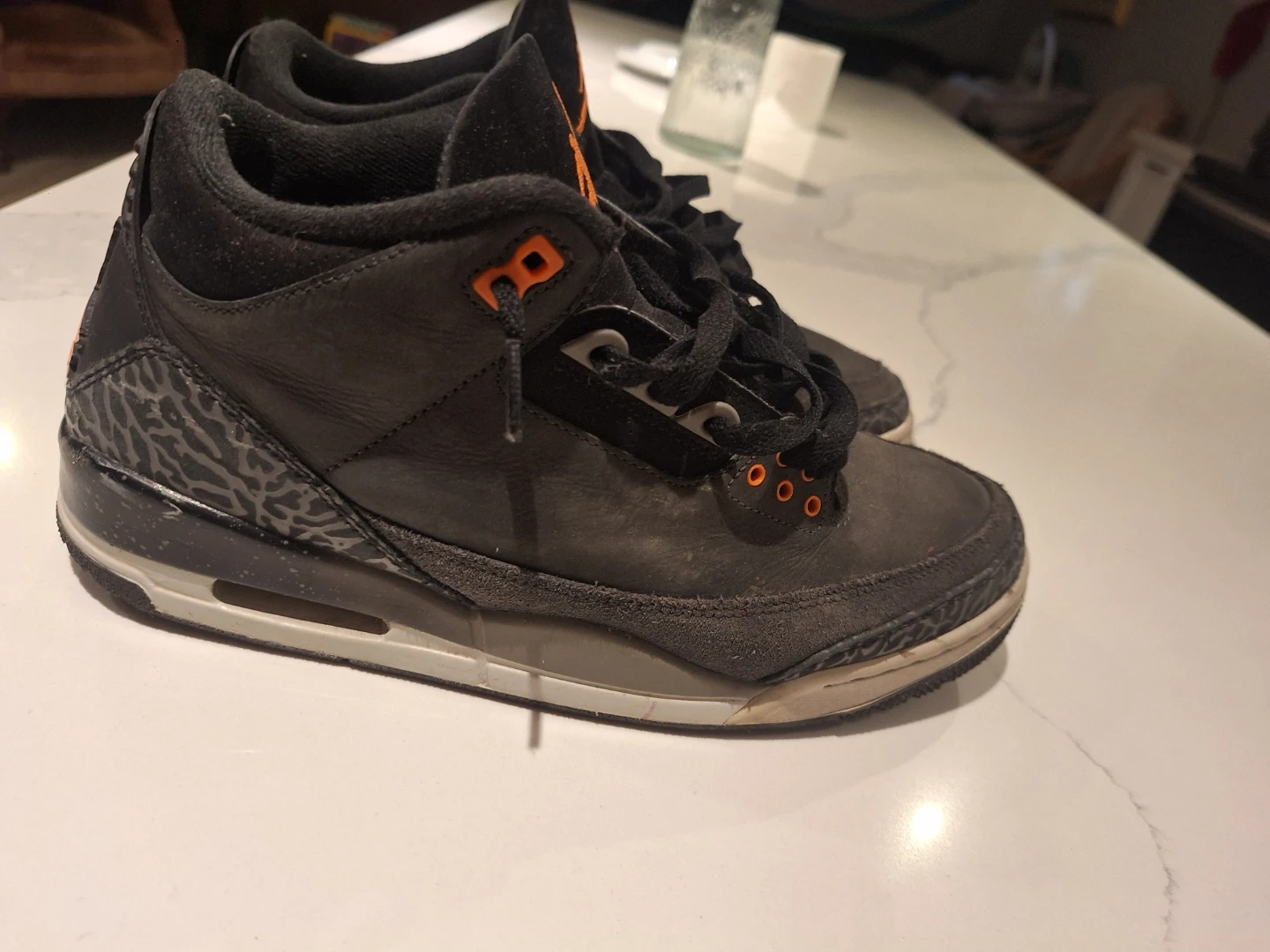 Classic Air Jordan 3 sneakers in a black and grey colourway with orange accents. Features the iconic Jumpman logo on the tongue and heel. Comes with original laces. These are mid-top basketball shoes.