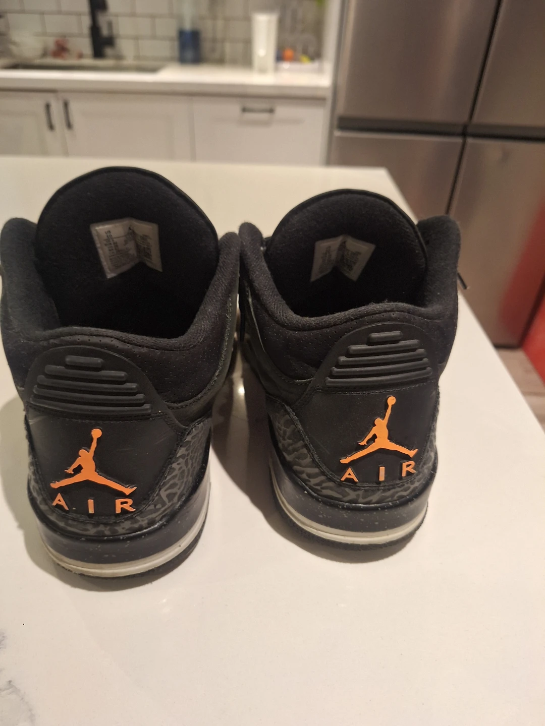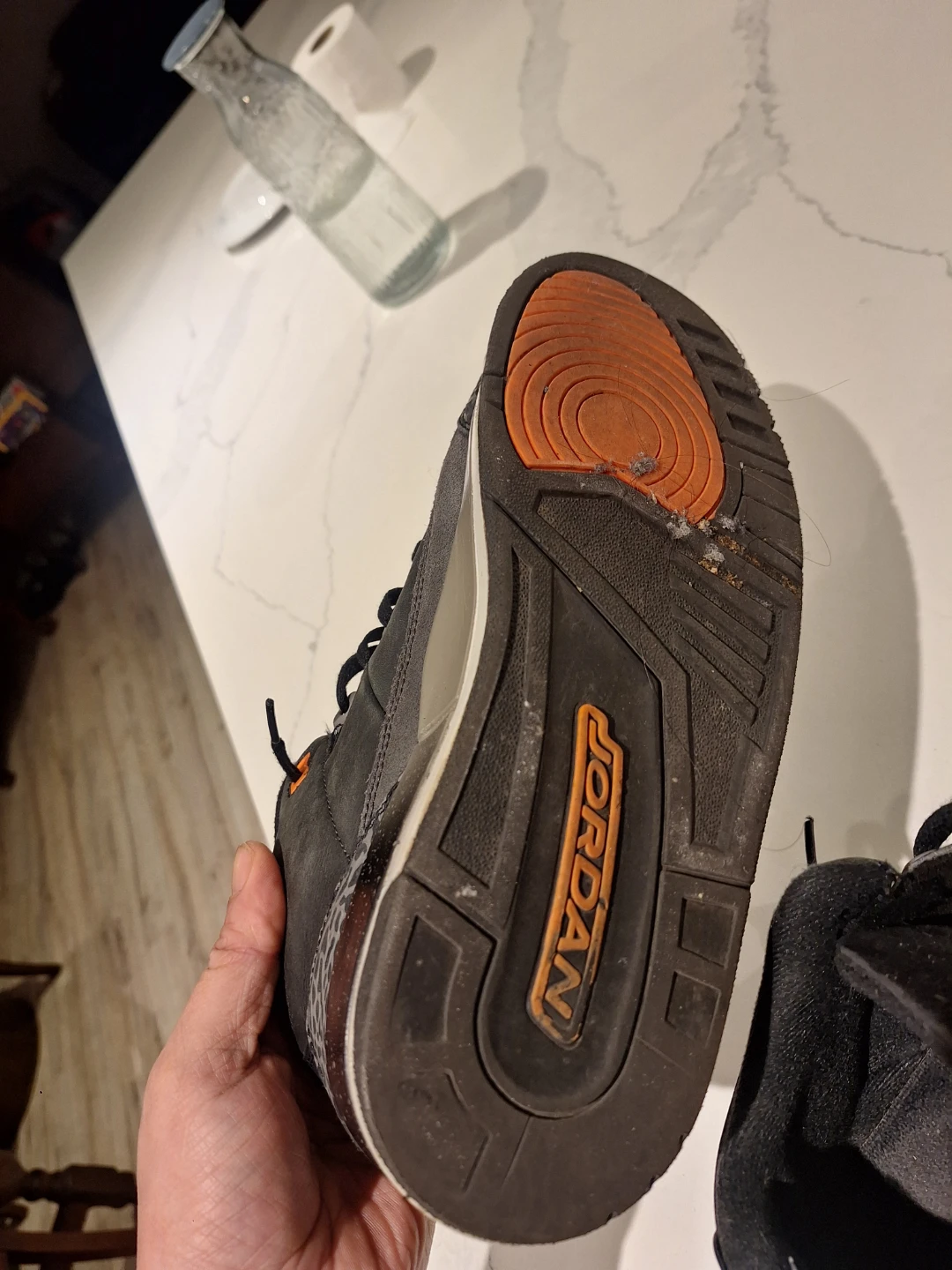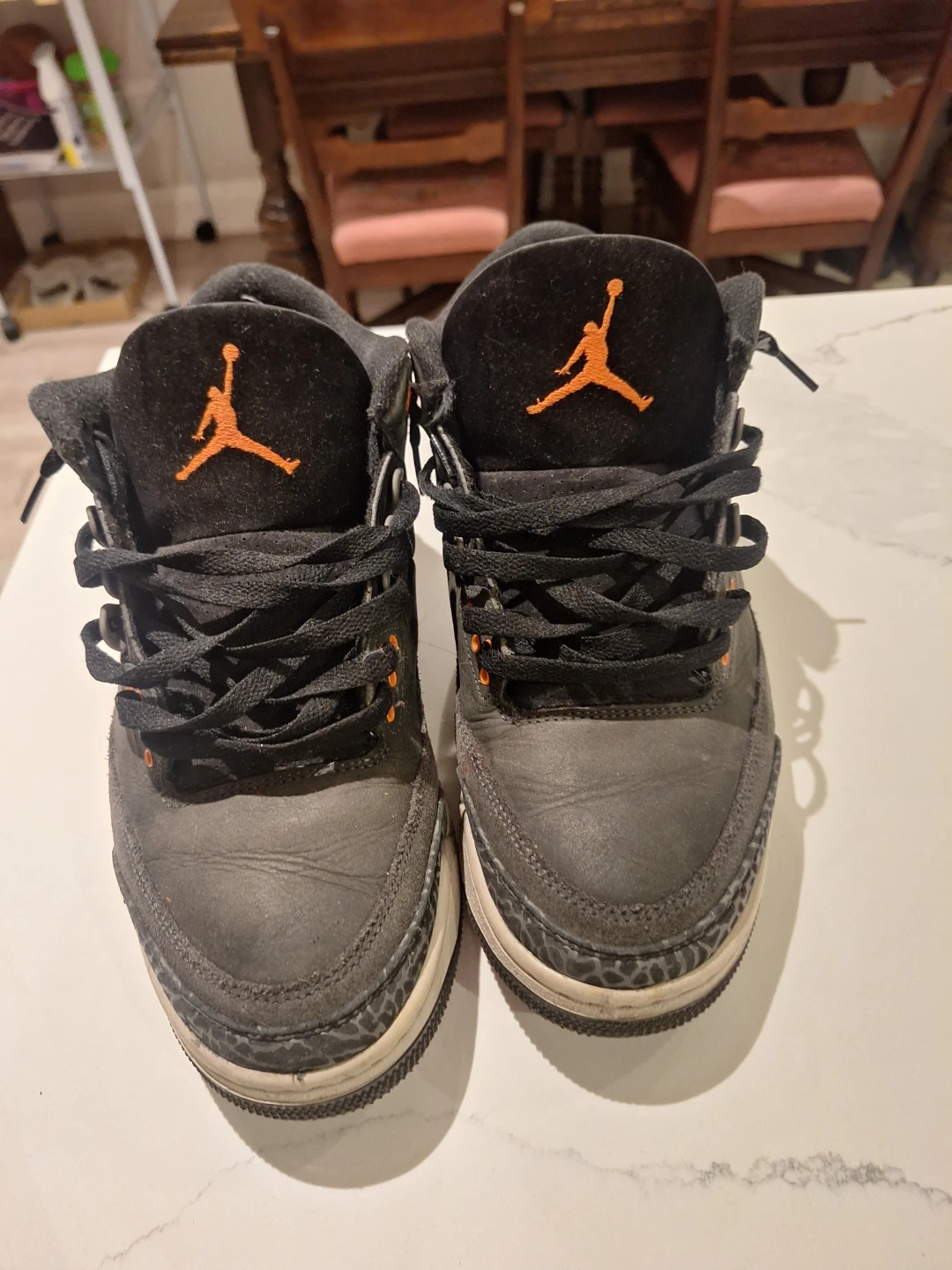 Classic Air Jordan 3 sneakers in a black and grey colourway with orange accents. Features the iconic Jumpman logo on the tongue and heel. Comes with original laces. These are mid-top basketball shoes.