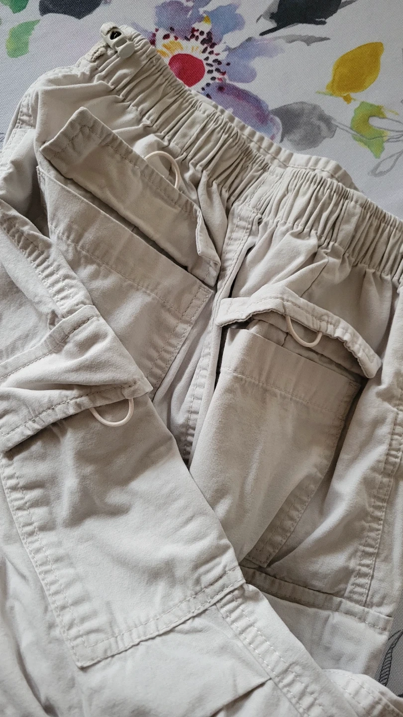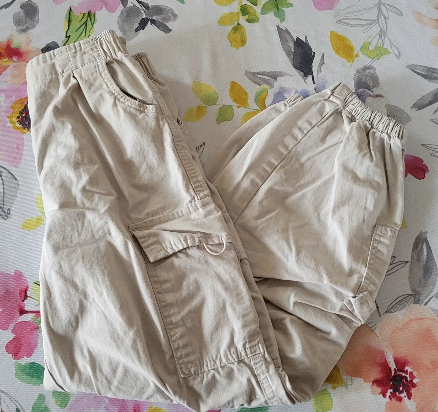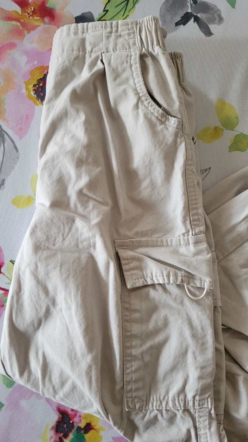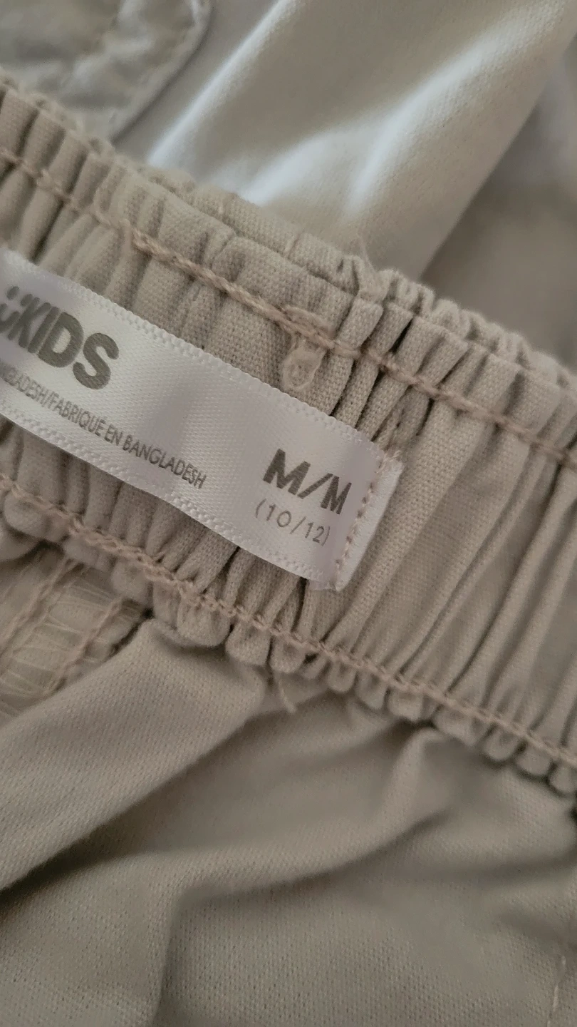 Kids cargo pants in a classic beige colour. These pants have an elastic waistband for comfort. They're great for everyday wear and outdoor activities. Size is medium, fitting 10-12.