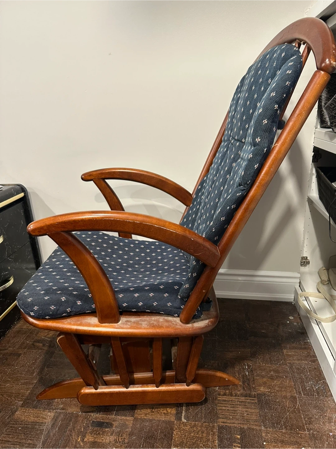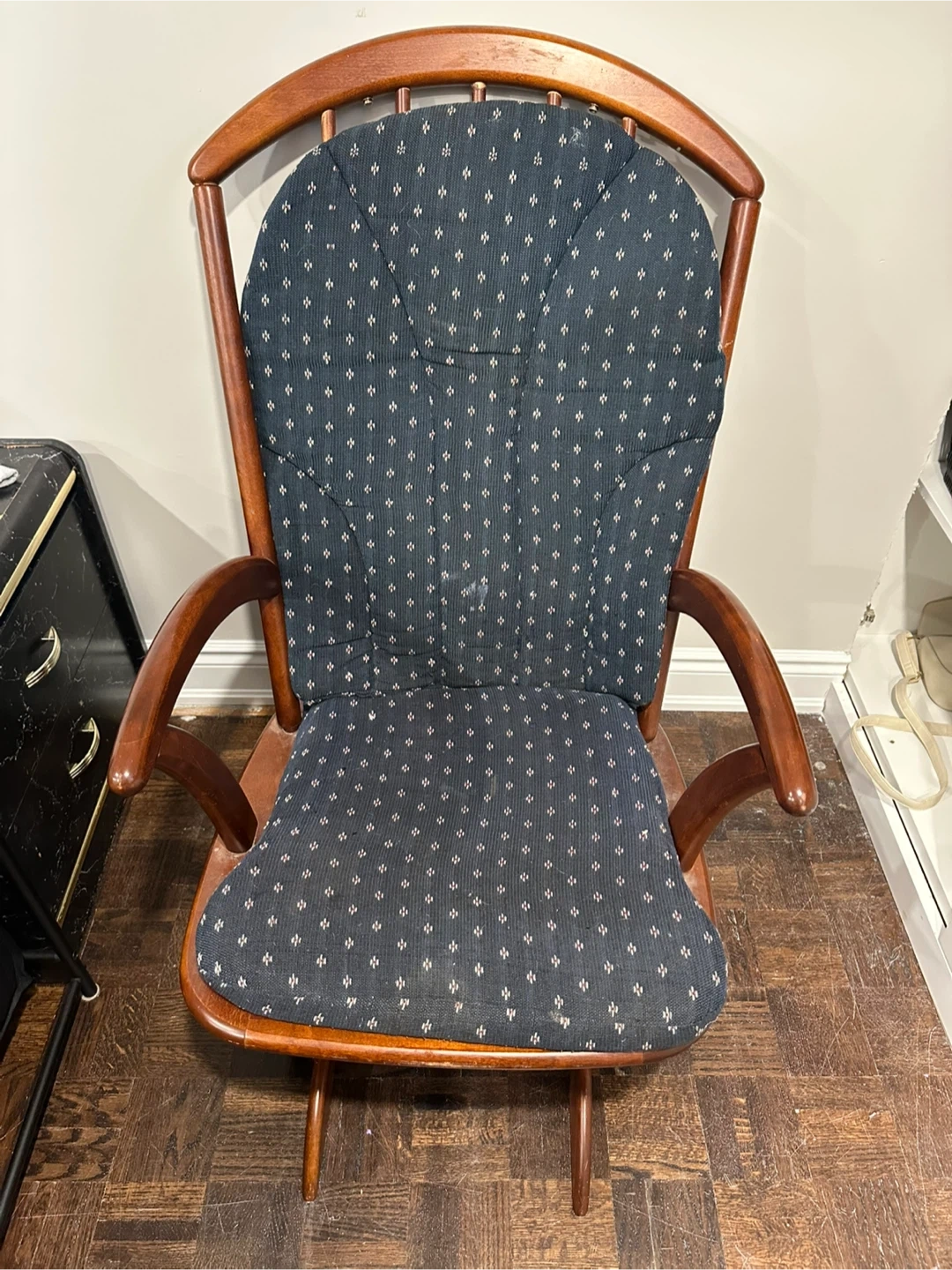 Selling a vintage wooden rocking chair. It has a classic design and would be a cozy addition to any room. The chair features a padded seat and back with a patterned fabric. Perfect for relaxing!