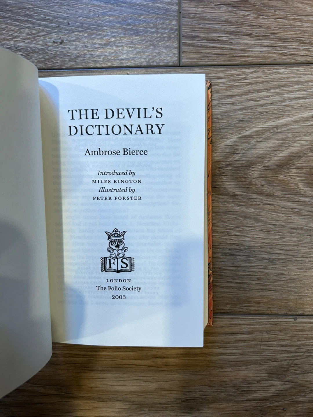 The Devil's Dictionary by Ambrose Bierce, published by The Folio Society in 2003. This edition is introduced by Miles Kington and illustrated by Peter Forster. It includes a slipcase for protection.