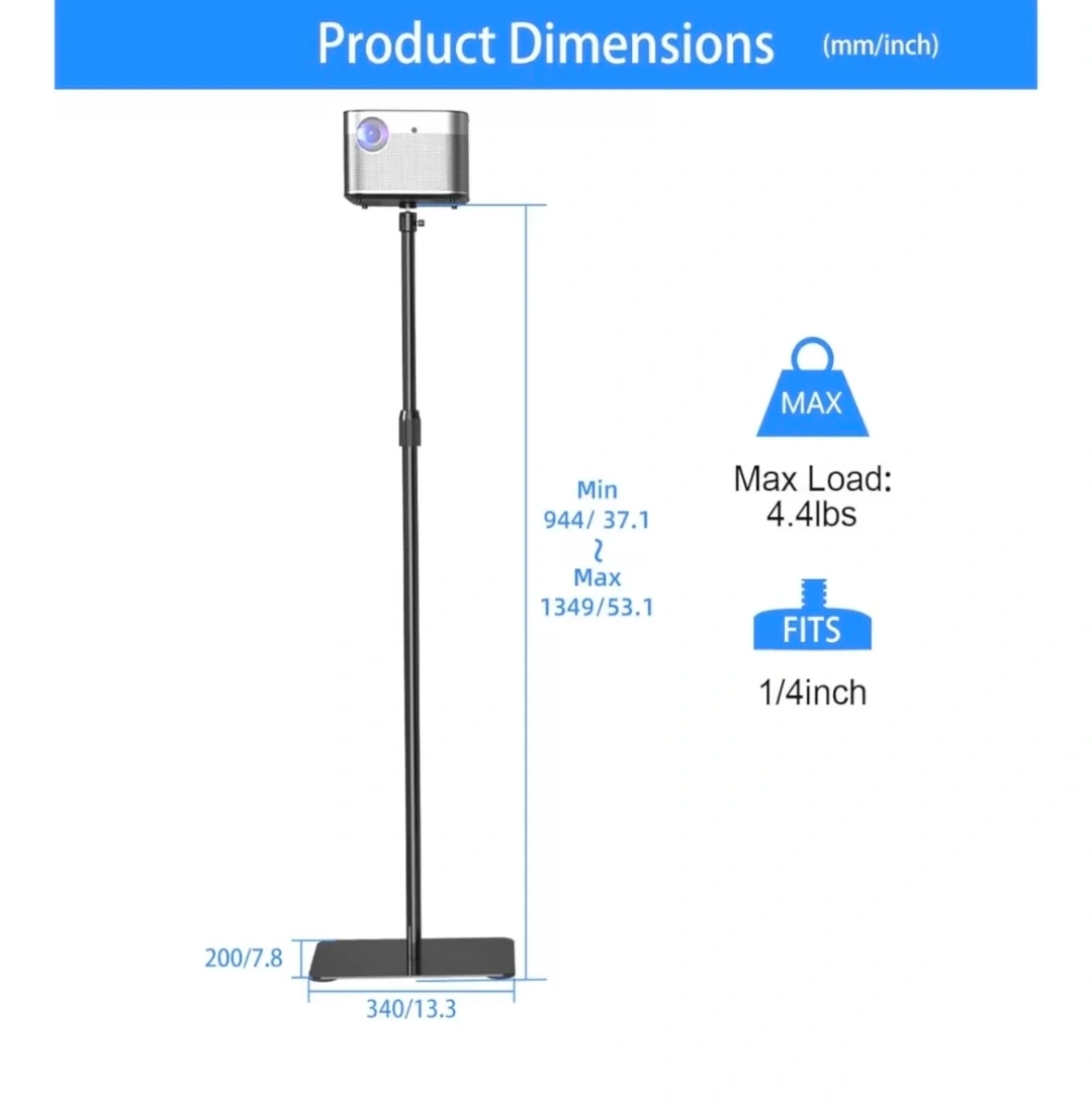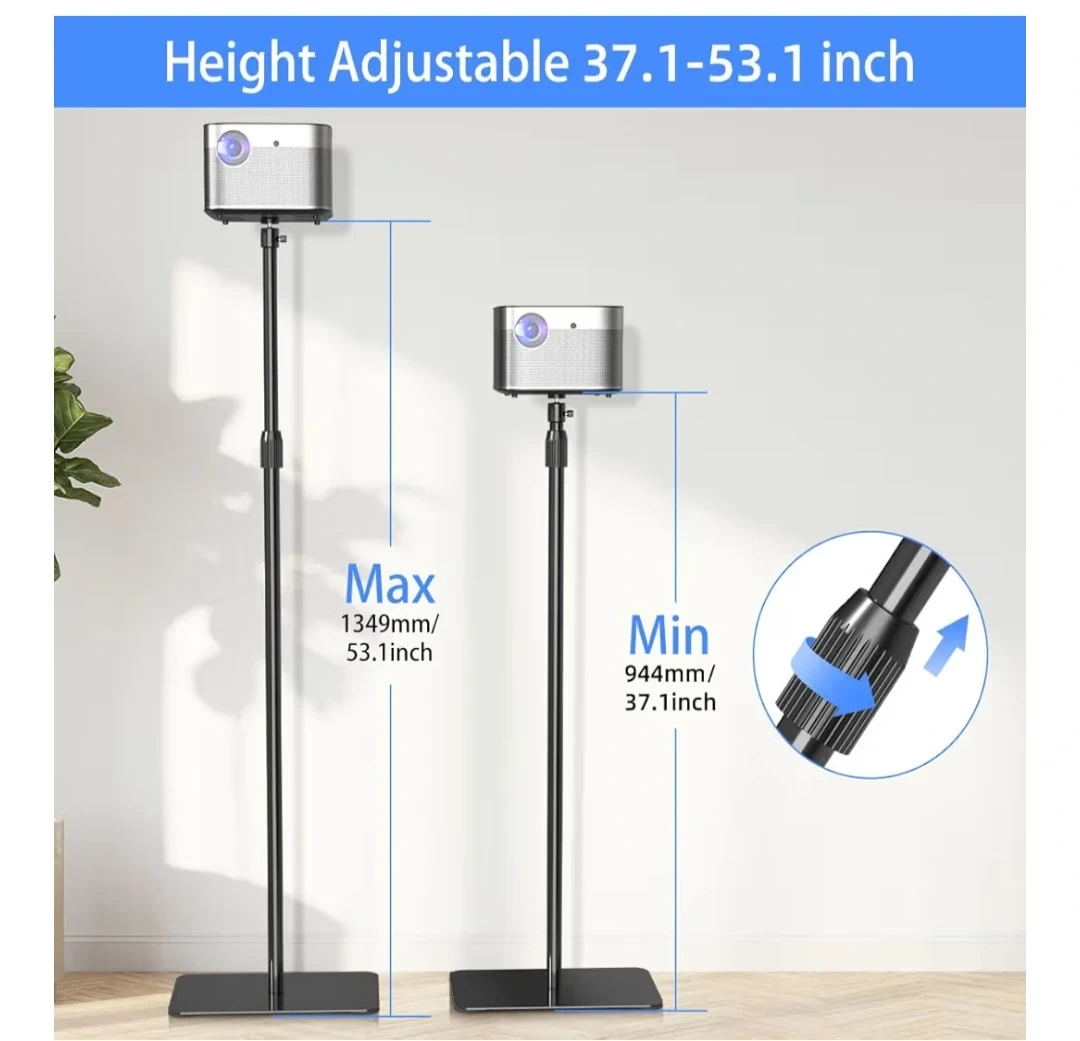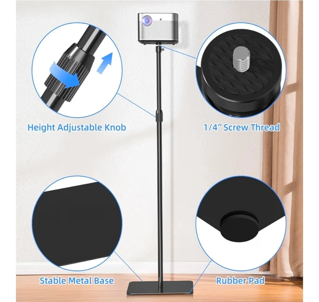 This is a versatile projector floor stand with a 1/4" screw thread mount. It's height adjustable from 37.1" to 53.1" and features a stable metal base with a rubber pad. The ball head allows for all-angle projection.