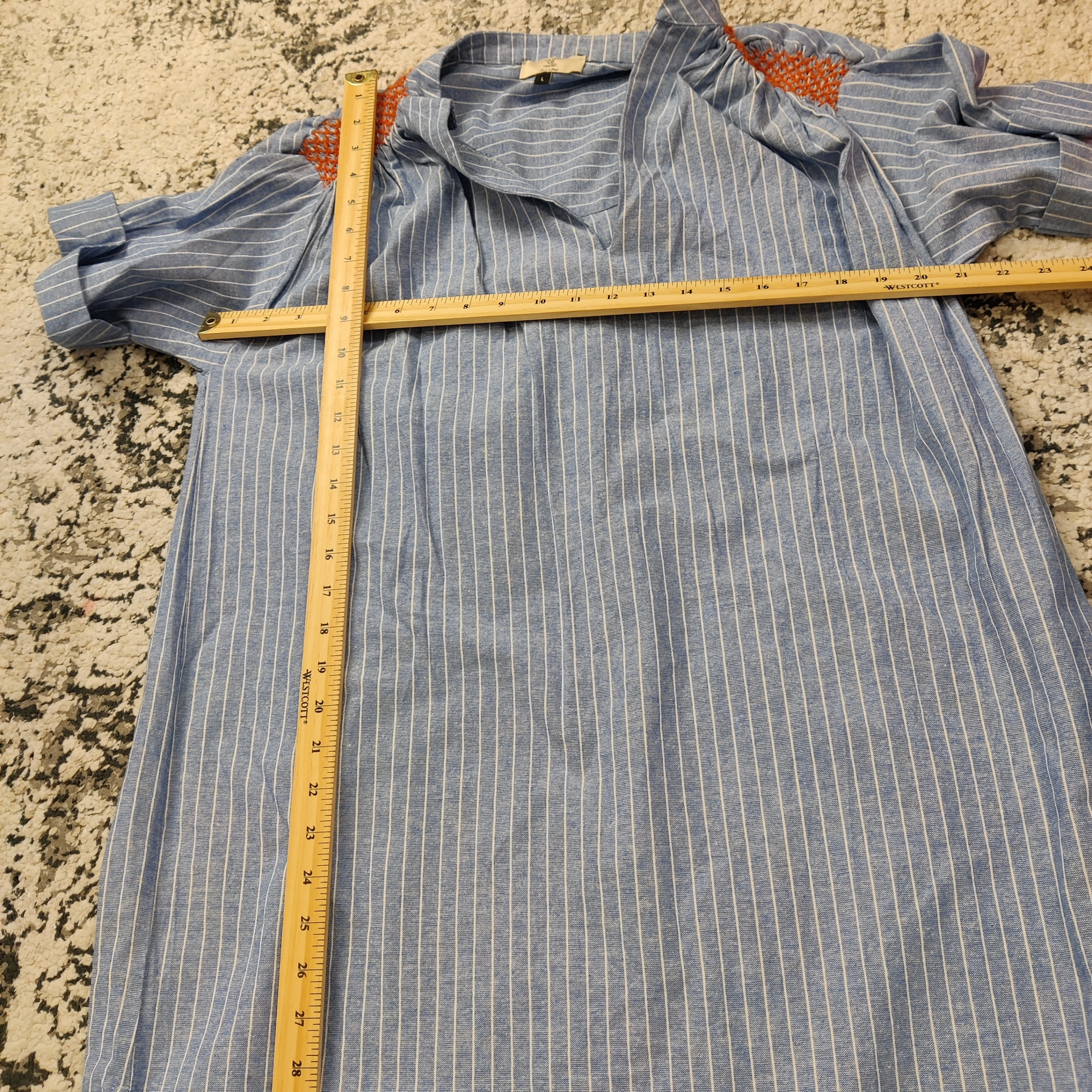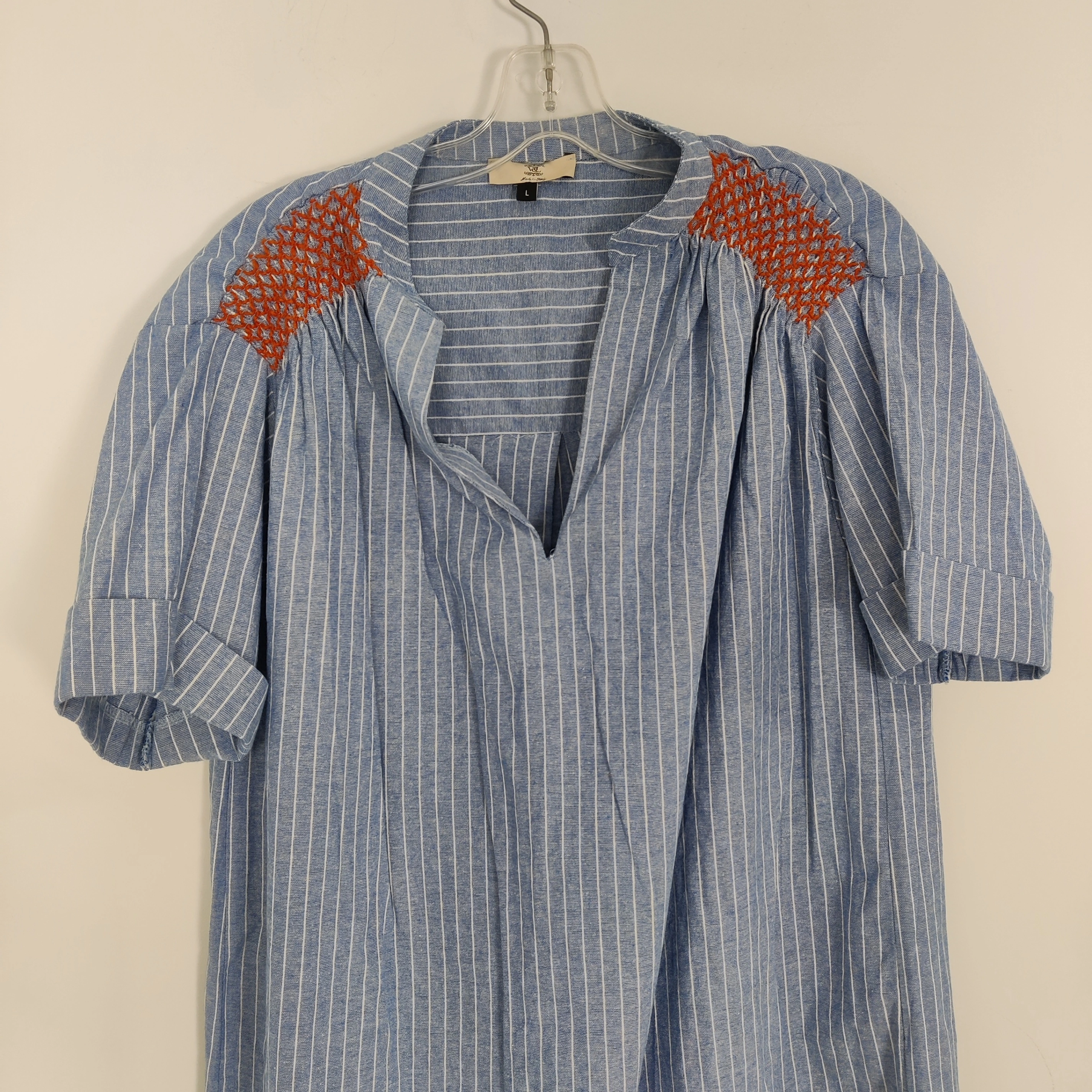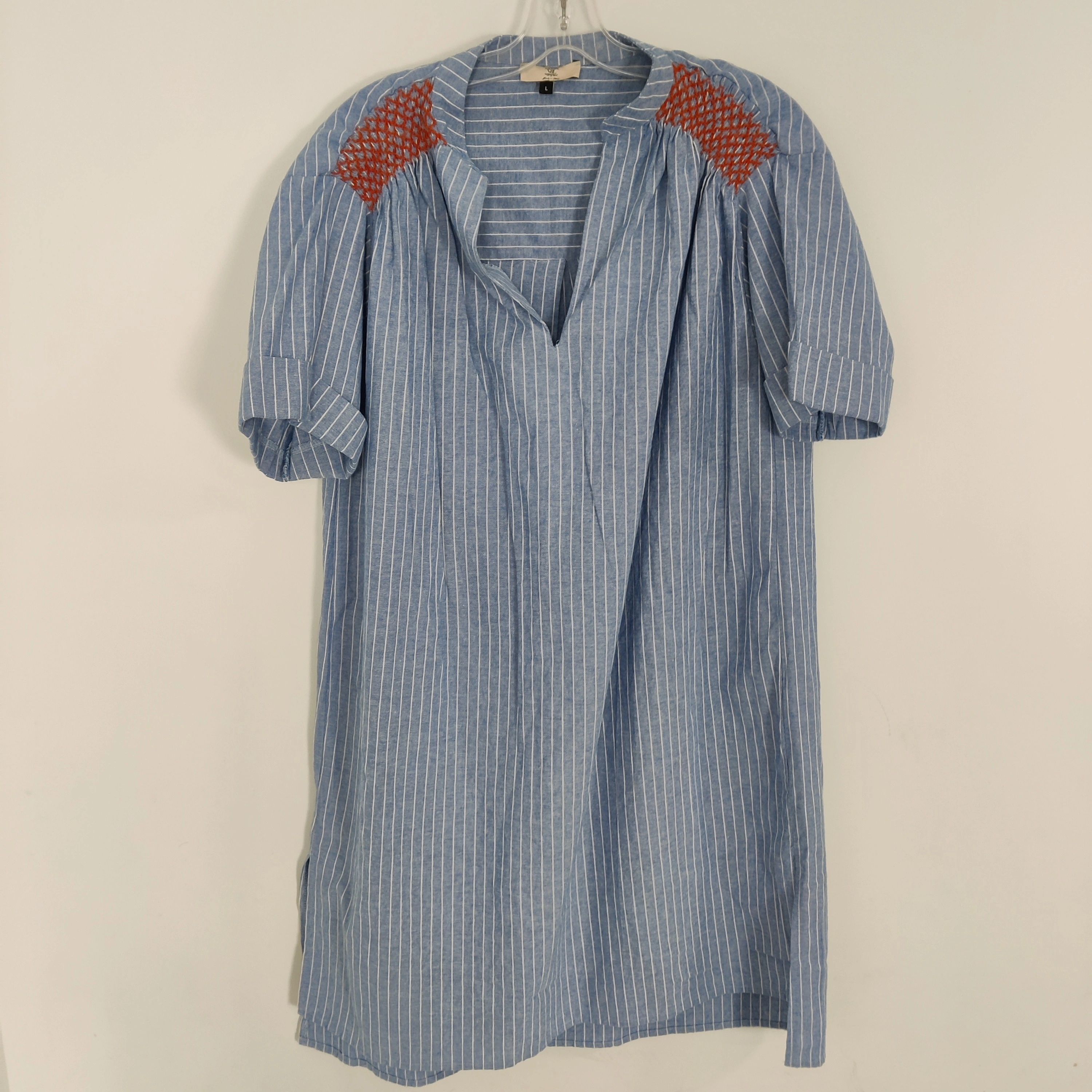 10Elegant and effortlessly stylish, this V&L Made in Italy blue and white striped tunic dress features charming red smocked embroidery on the shoulders. Crafted from a breathable 76% cotton and 24% polyester blend, it offers a relaxed fit with short sleeves and a flattering V-neckline. Perfect for spring and summer days, this versatile dress pairs beautifully with sandals or sneakers for a casual yet refined look. Size Large. In good used condition Measurements are approximate and taken laying flat Follow me on Instagram @renewifyupcycle for unique upcycled items V&L dress, Made in Italy, blue striped dress, embroidered shoulders, smocked detail, cotton blend dress, tunic dress, boho chic, summer fashion, relaxed fit, short sleeve dress, Italian clothing, casual women’s wear, lightweight dress