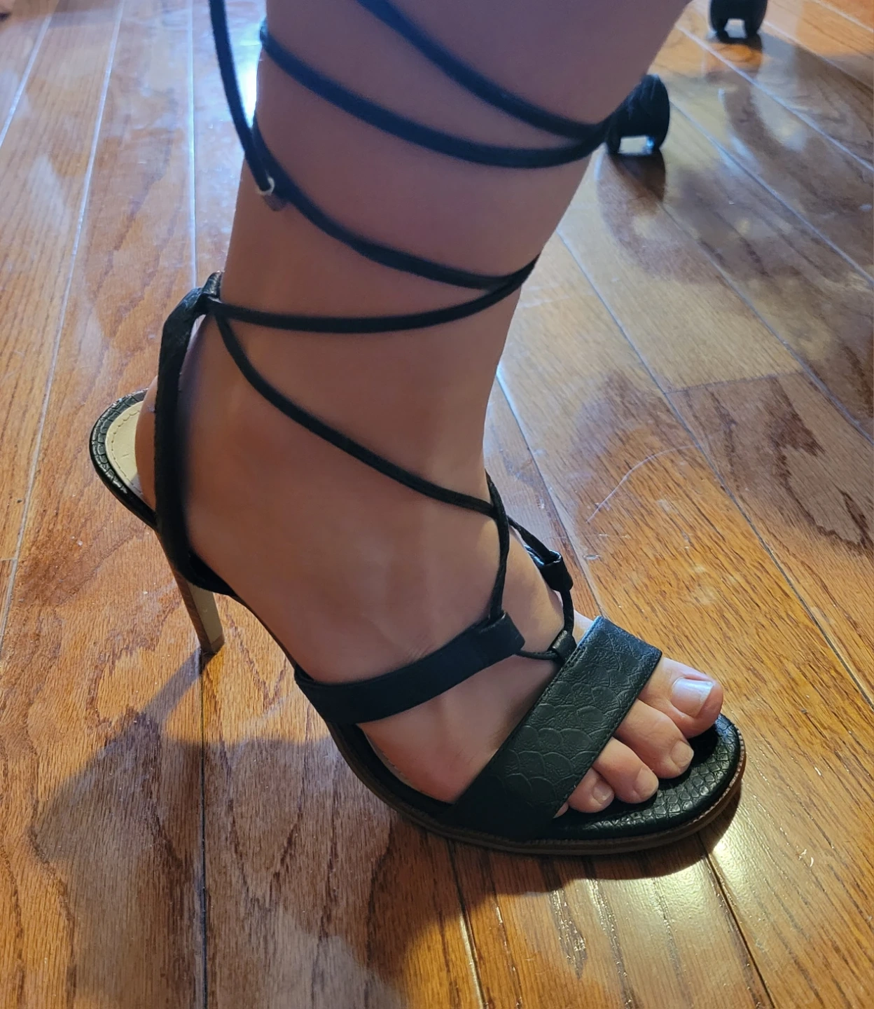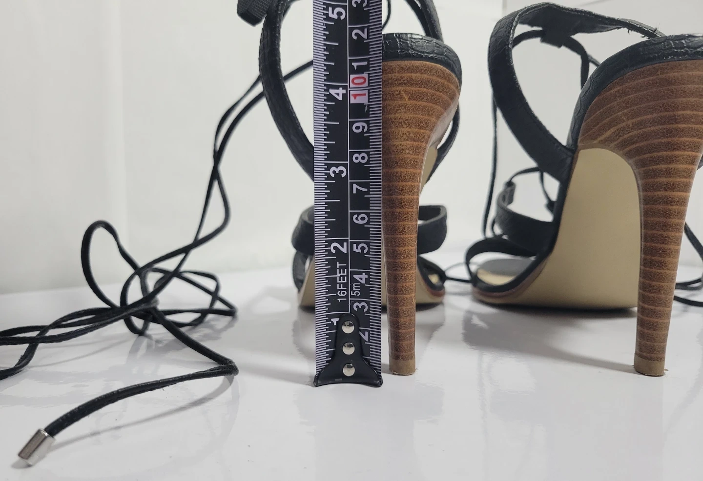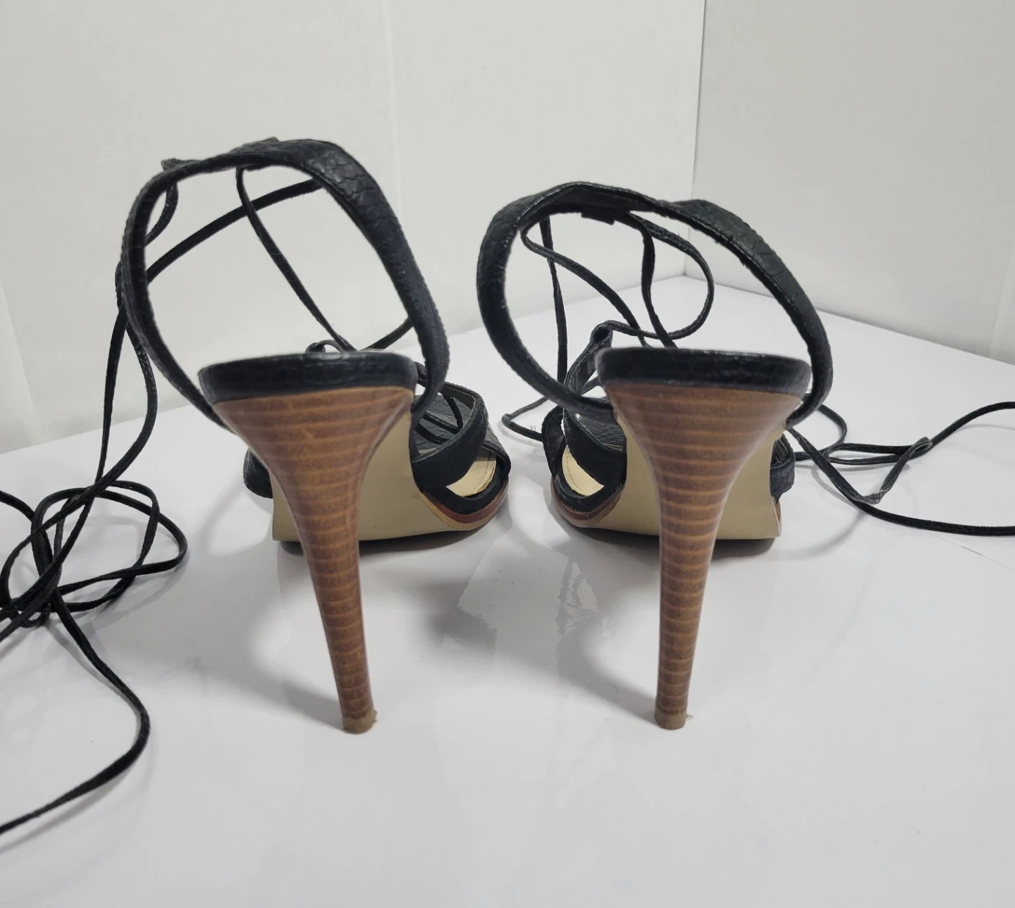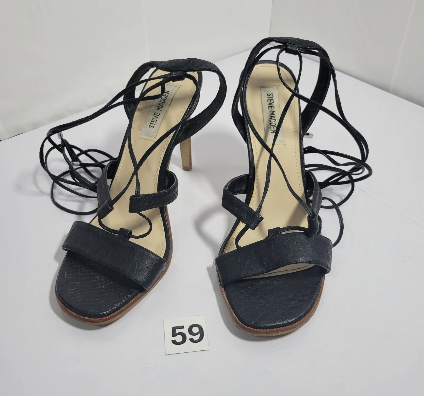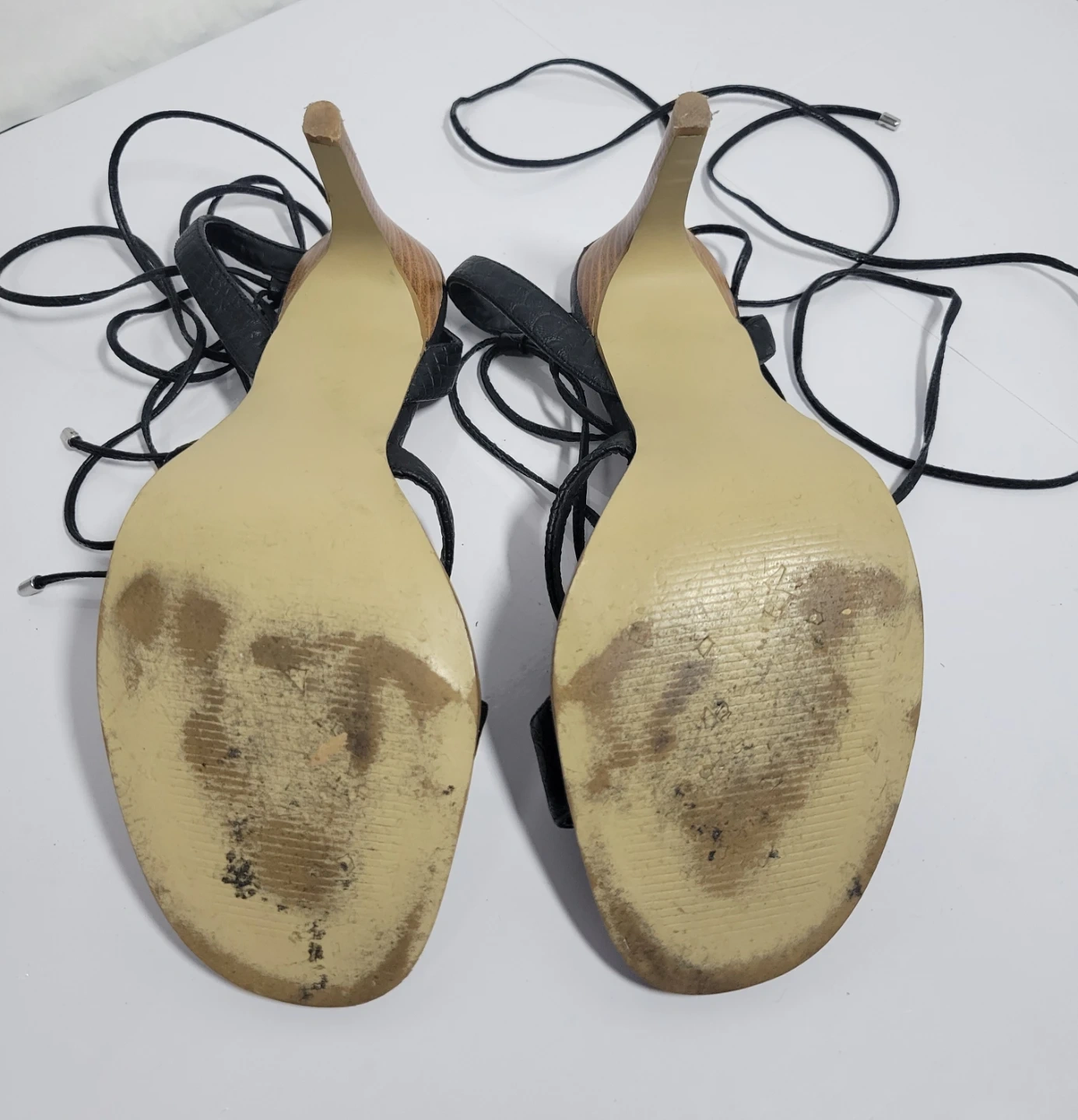 Black strappy heels by Steve Madden. These have a wood-grain stiletto heel and wrap-around ankle ties. Heel height is approximately 4 inches. Size 10 (40-40,5 EU). Great condition