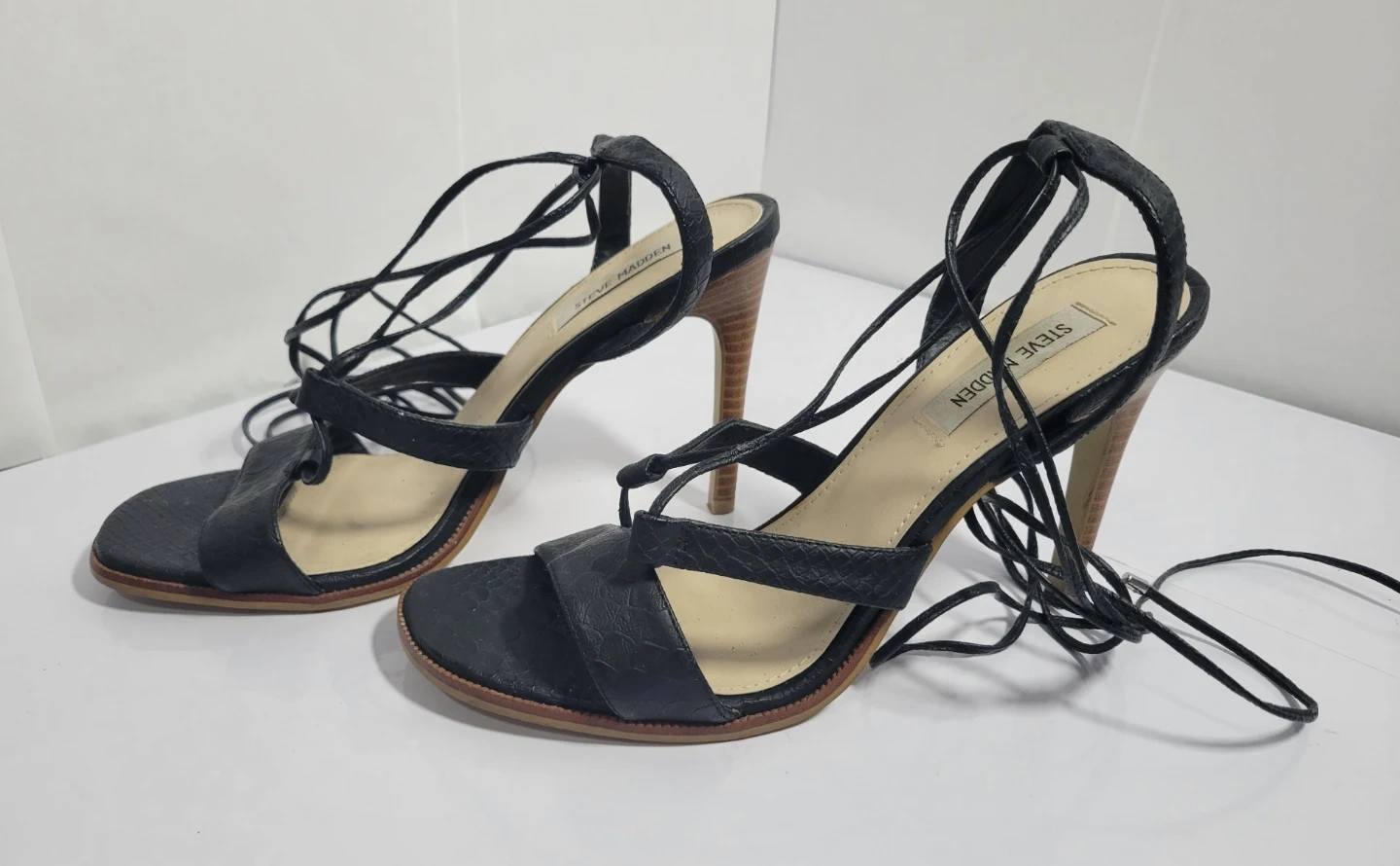 Black strappy heels by Steve Madden. These have a wood-grain stiletto heel and wrap-around ankle ties. Heel height is approximately 4 inches. Size 10 (40-40,5 EU). Great condition