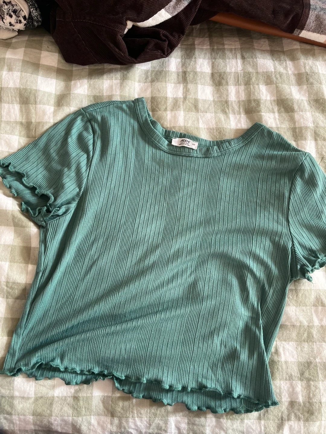 This Ardene top is a cute, short-sleeved, ribbed material in a pretty green colour. It has a lettuce trim on the sleeves and hem. It's a versatile piece that can be dressed up or down. Size is medium.