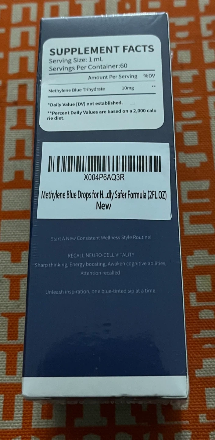 Methylene Blue Trihydrate solution. This 60ml bottle contains 60 servings, with each serving at 1ml delivering 10mg. It's lab tested for quality and consistency. MFG: August 30, 2025.