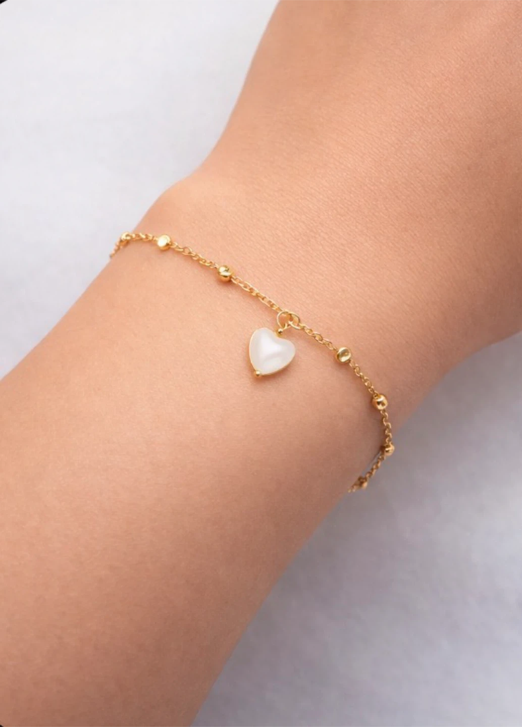 This is a cute jewelry set featuring a gold-tone chain bracelet with a heart charm and matching dangle earrings. They're made with faux pearls and gold-tone metal. Perfect for adding a touch of sweetness to any outfit!