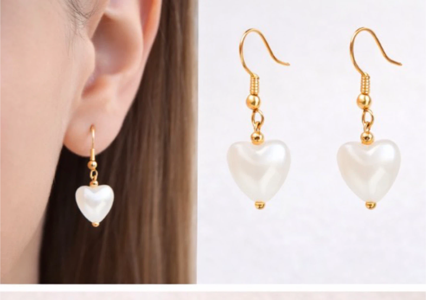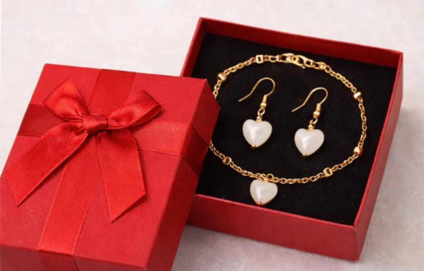 This is a cute jewelry set featuring a gold-tone chain bracelet with a heart charm and matching dangle earrings. They're made with faux pearls and gold-tone metal. Perfect for adding a touch of sweetness to any outfit!