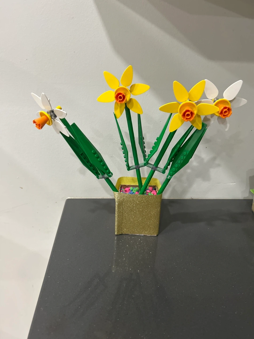 This is a LEGO flower bouquet featuring daffodils. It's a fun way to add a touch of colour to any space.