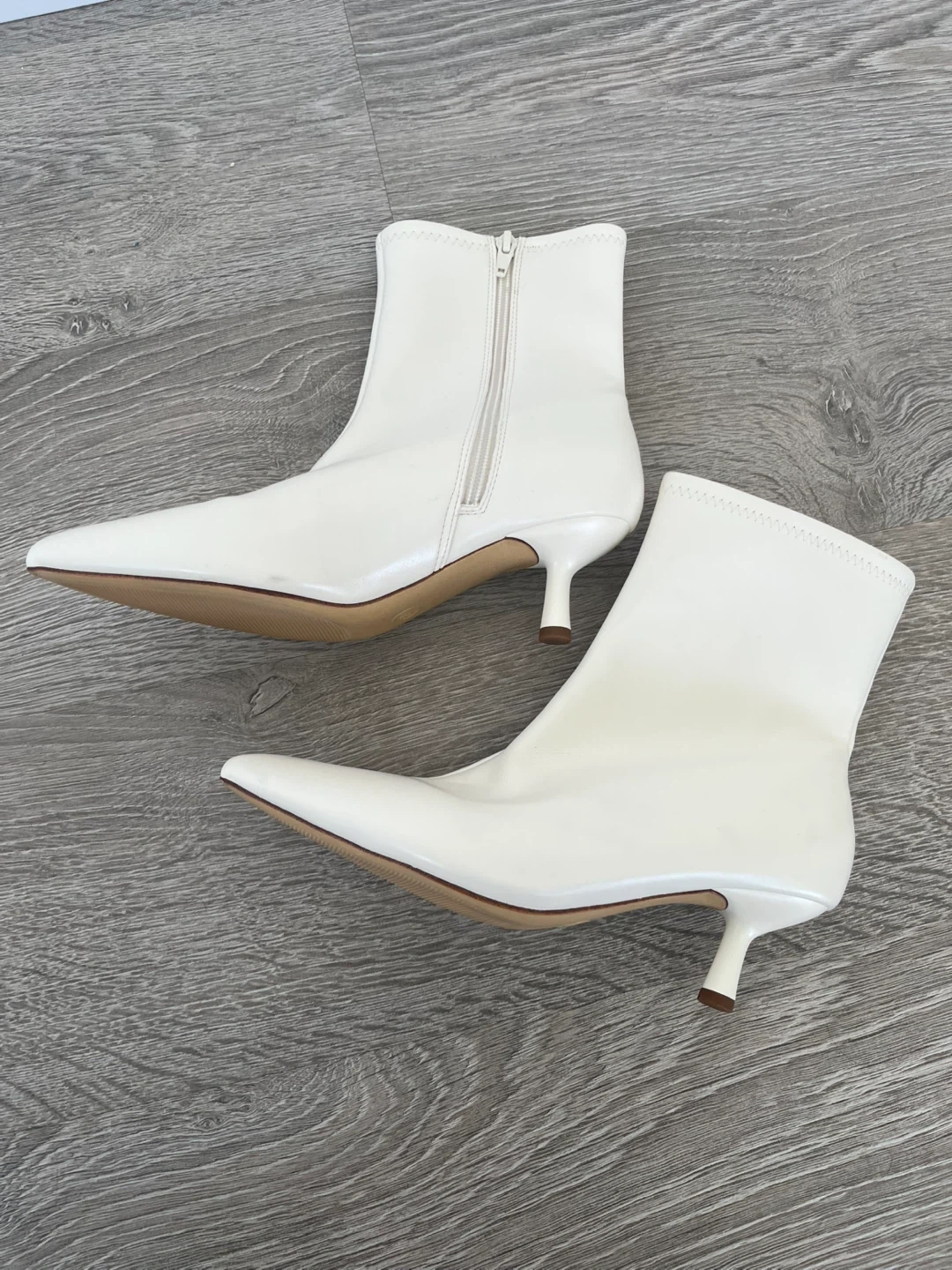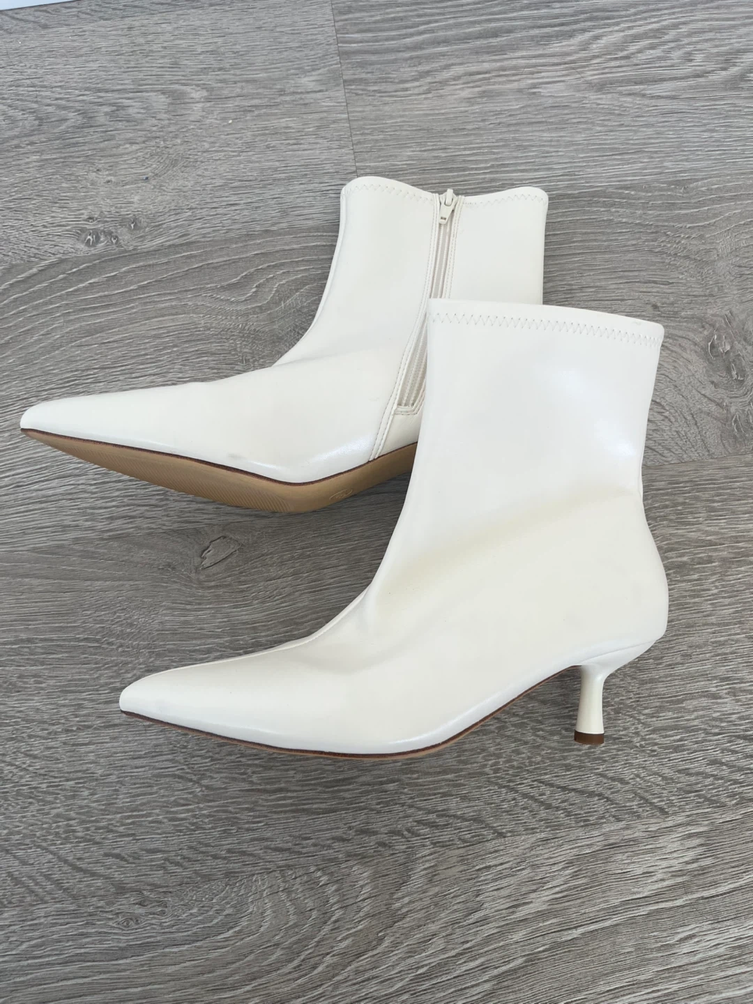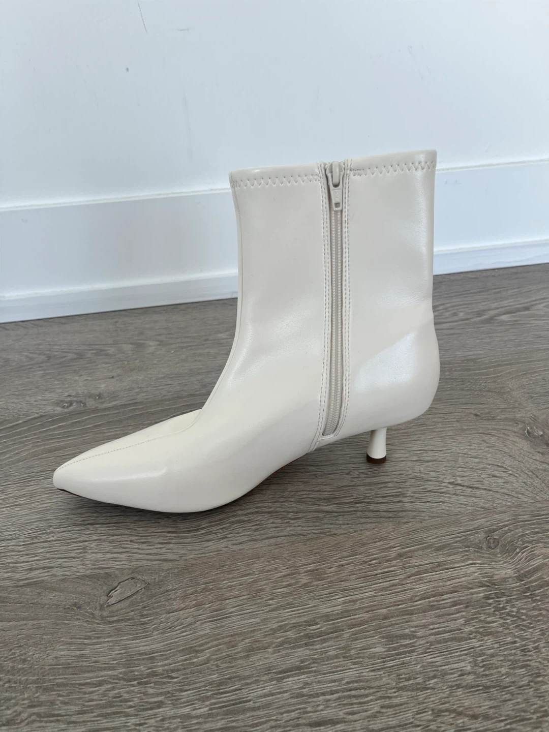 White leather ankle boots with a pointed toe and a kitten heel. They have a side zipper closure for easy on and off.