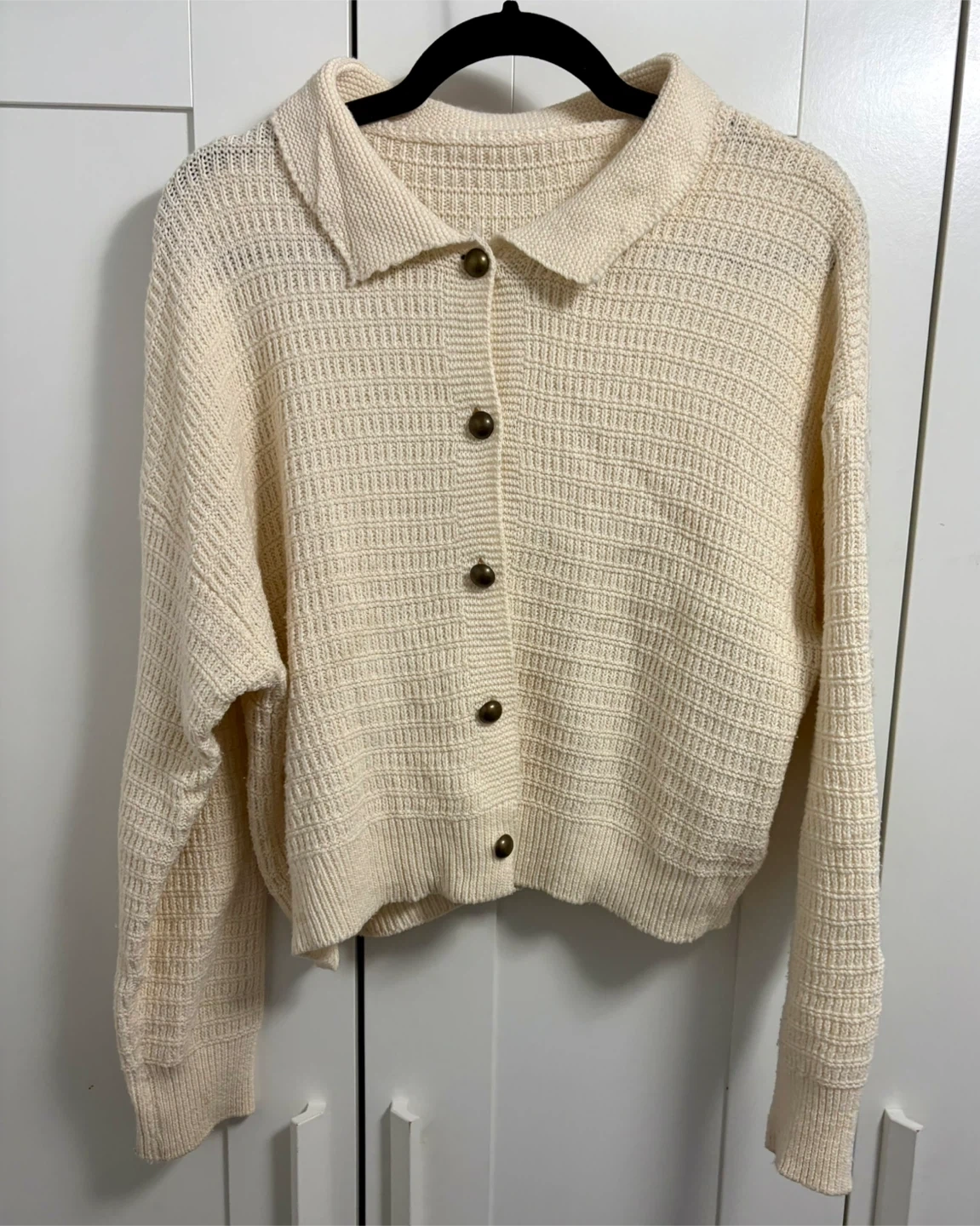 This is a cream-coloured knit cardigan with a collared neckline and button-up front. The size is around S-M.