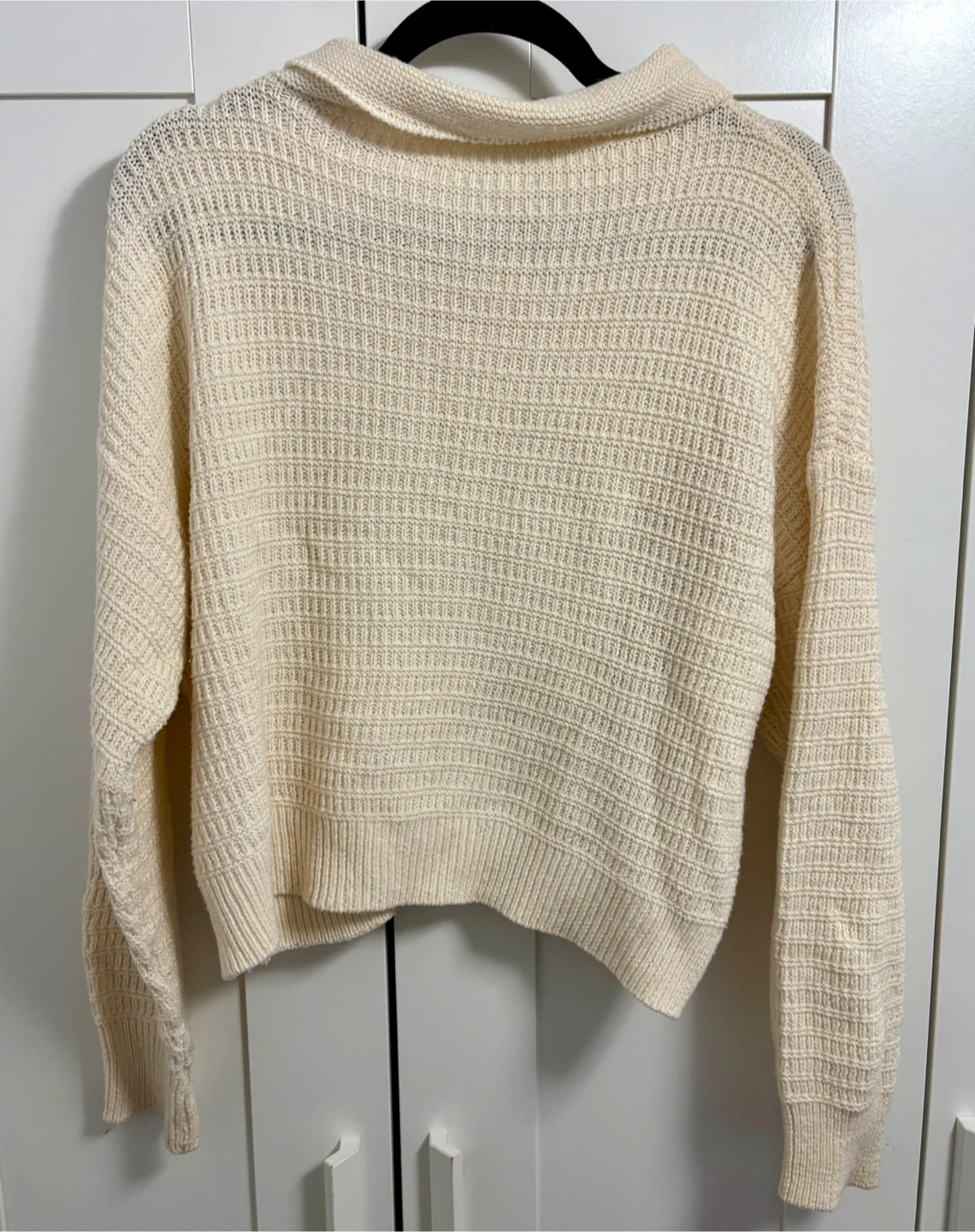 This is a cream-coloured knit cardigan with a collared neckline and button-up front. The size is around S-M.