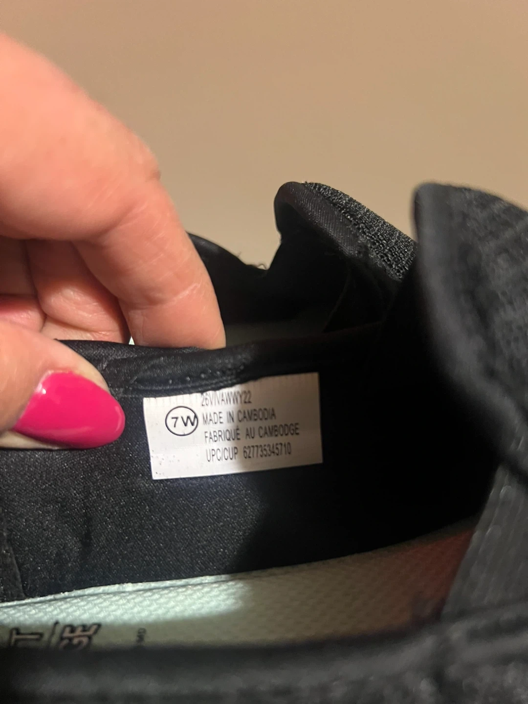 Athletic Works women's slip-on shoes in black. Features a wide fit and memory foam insoles for comfort. Made in Cambodia. Non-marking soles.