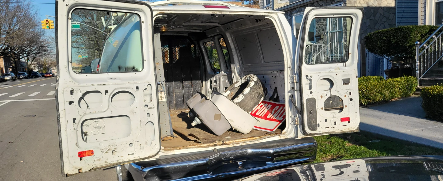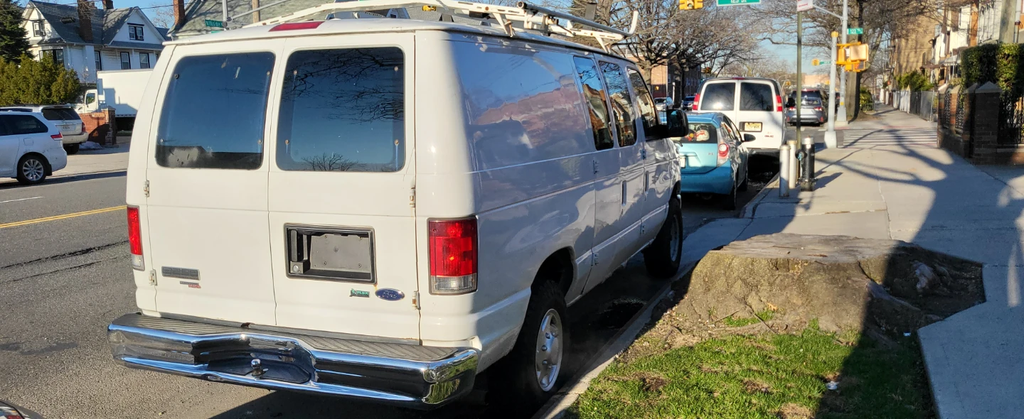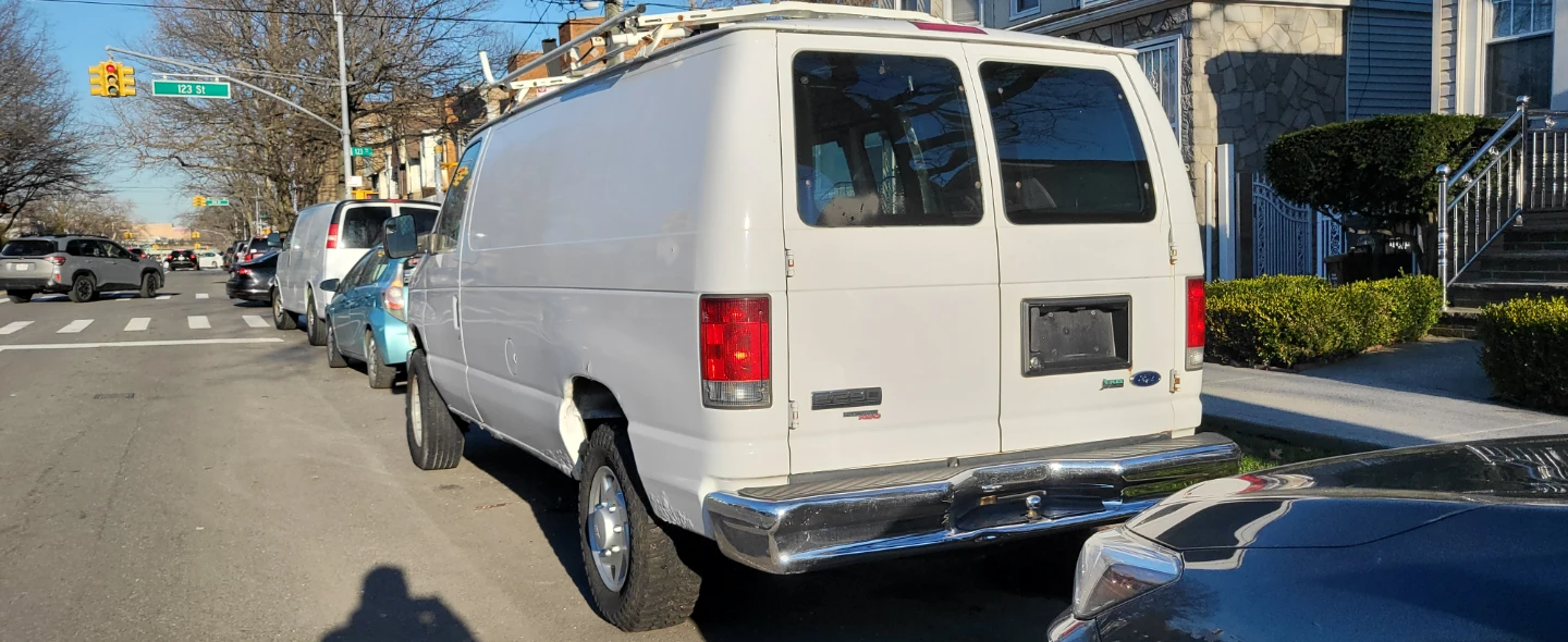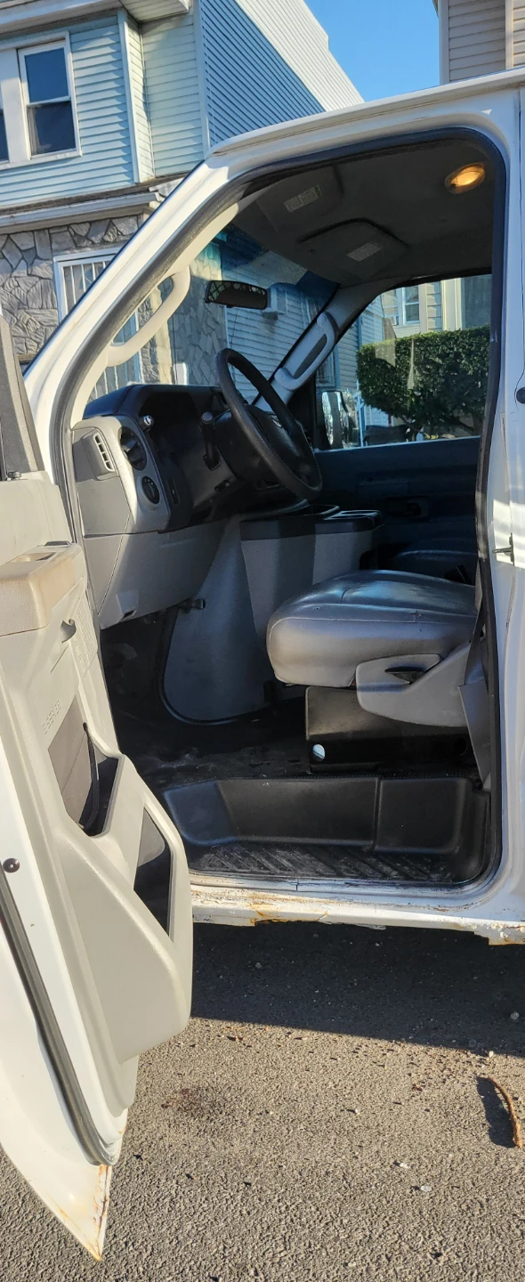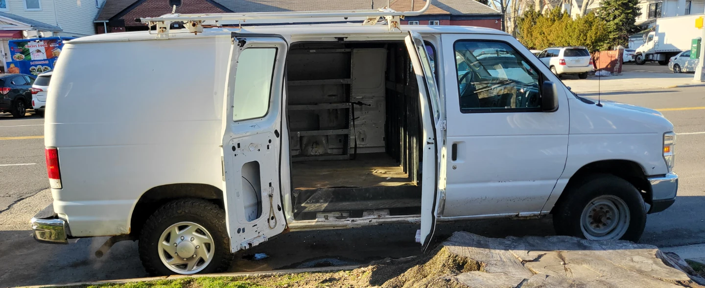 White Ford E-Series cargo van. Rack on top. Interior is gutted and ready for customization. This van's robust frame makes it suitable for a work vehicle.