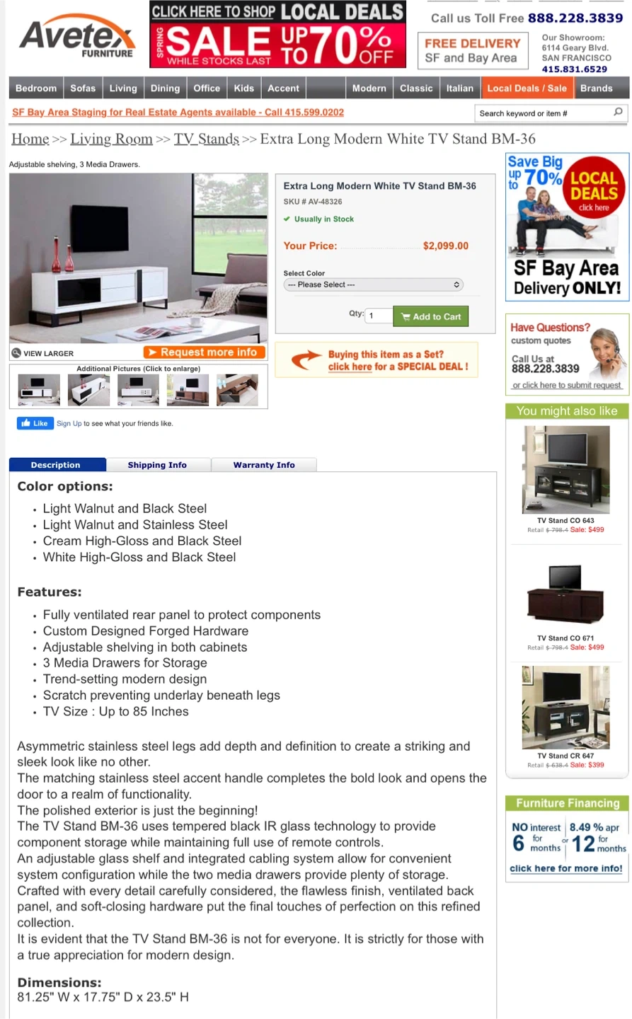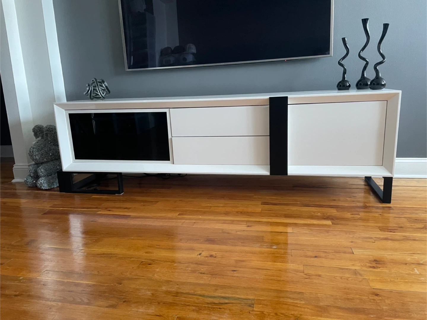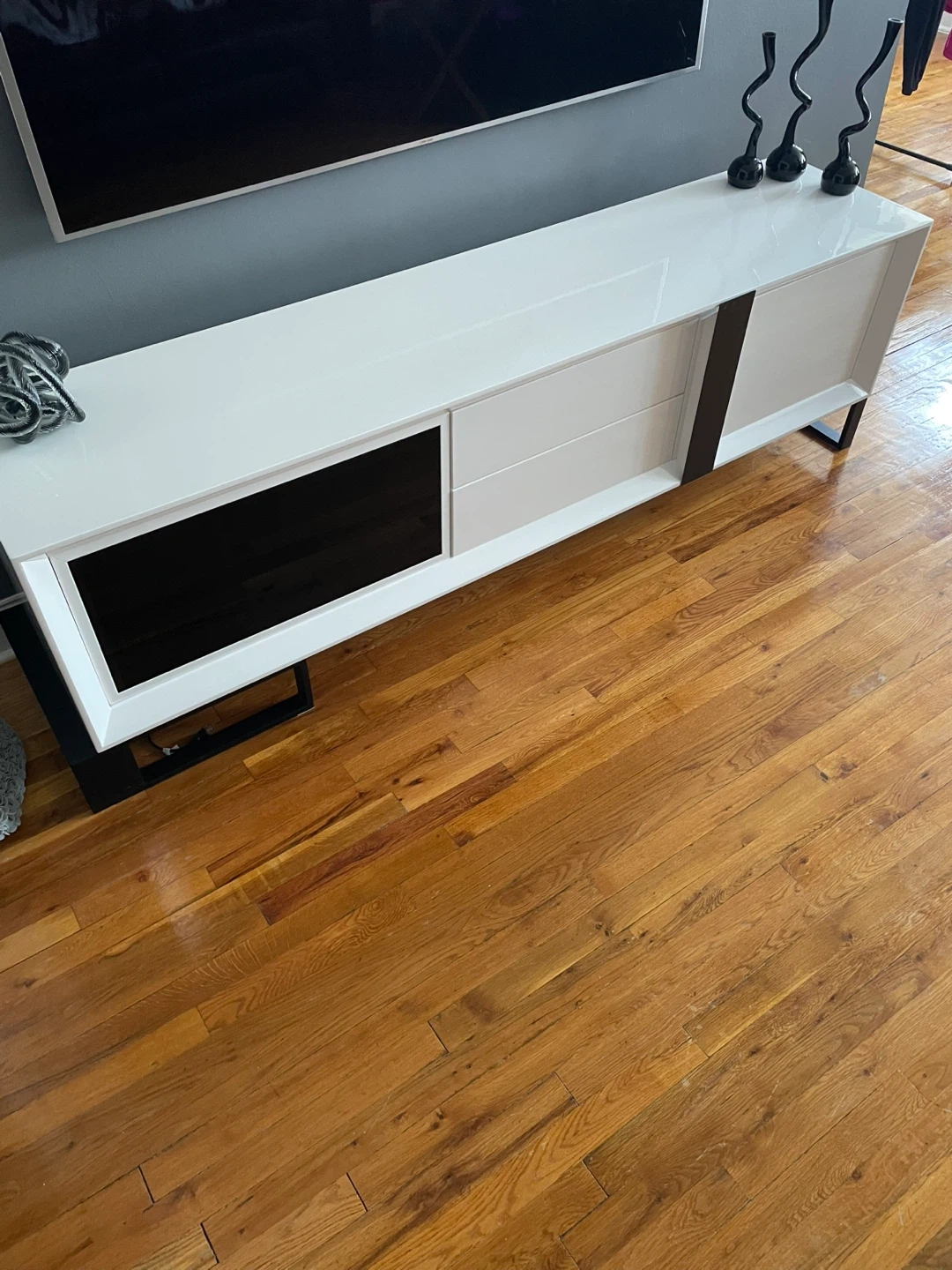 This sleek white TV stand offers ample storage with drawers and cabinets. Its modern design fits well in any living space. Dimensions: 78" W x 16" D x 22" H.