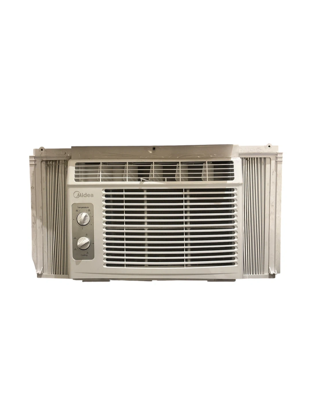 This is a Midea window air conditioner unit. It has adjustable temperature and cooling controls. The side panels offer adjustable width for window installation.