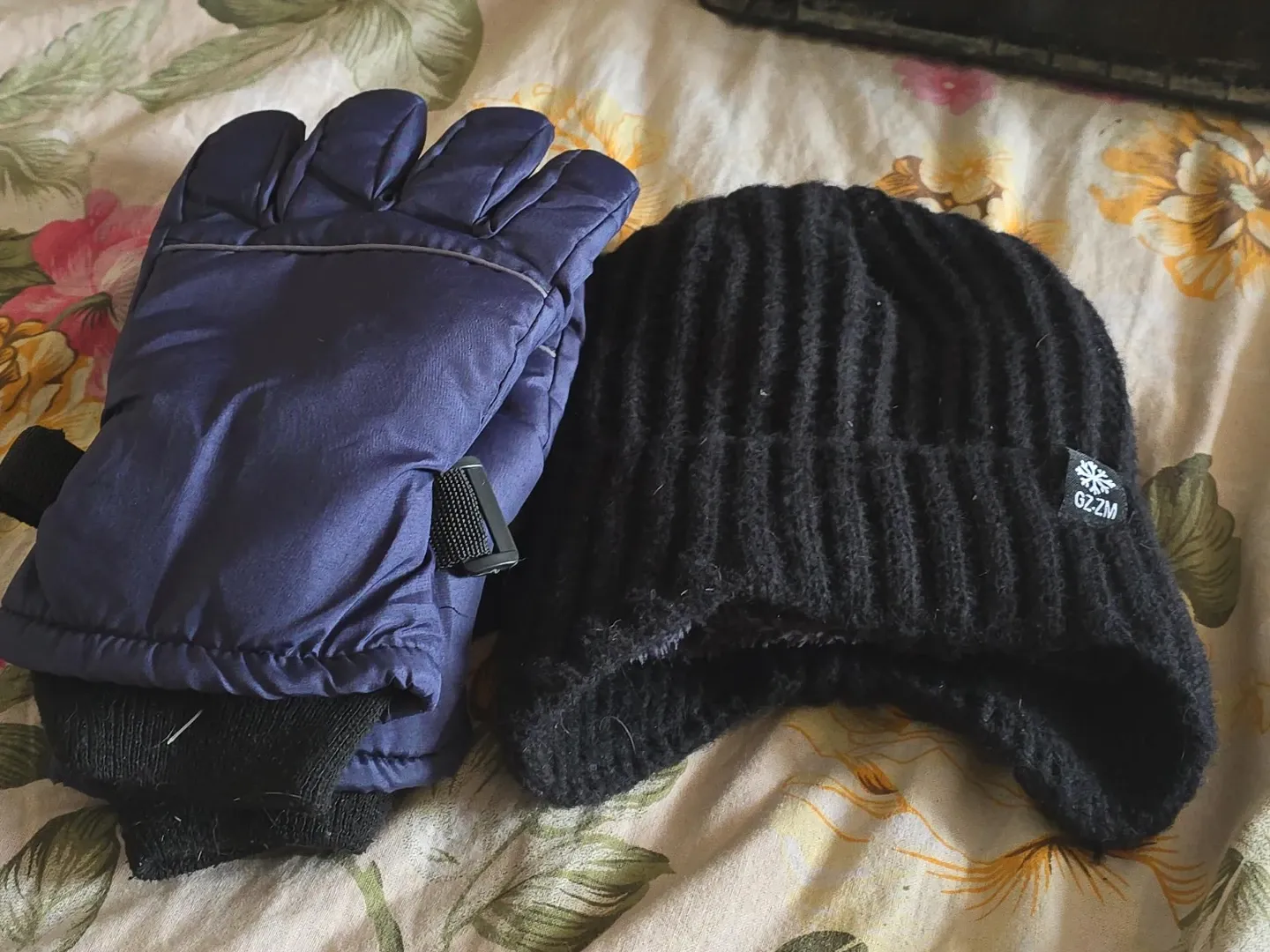 Black knit beanie with ear flaps and insulated navy blue winter gloves. Set includes one hat and one pair of gloves. Perfect for keeping warm on chilly days!