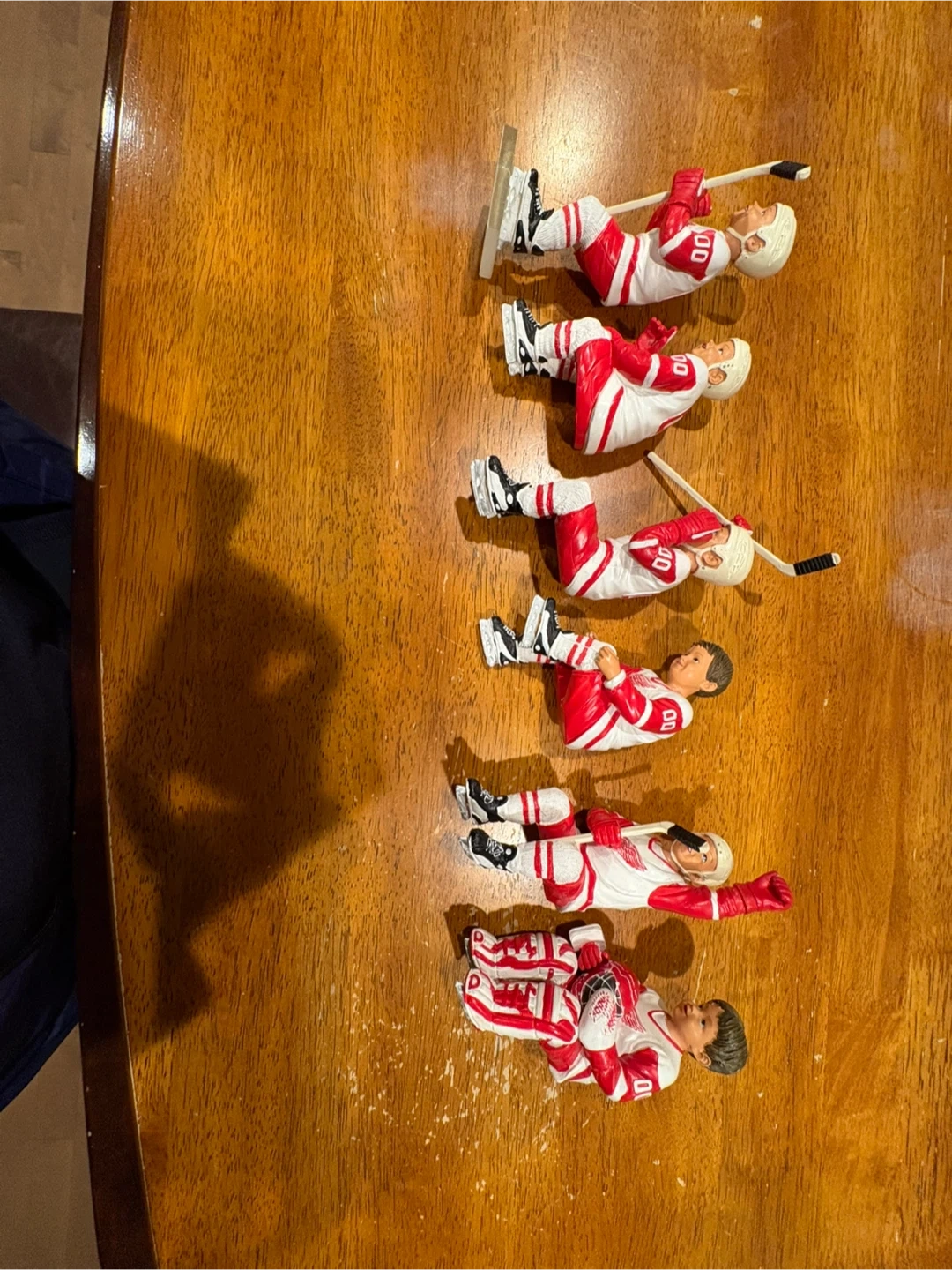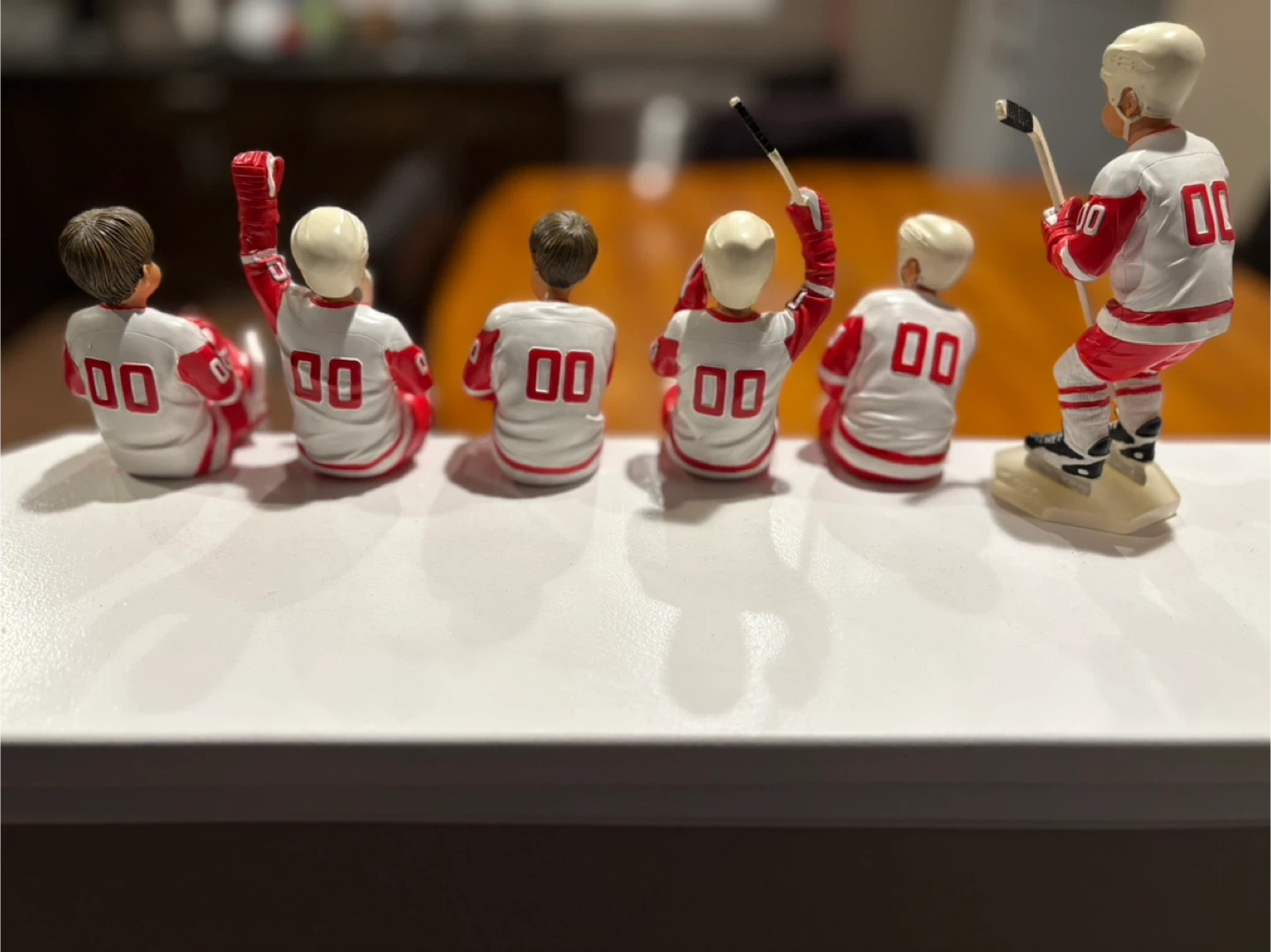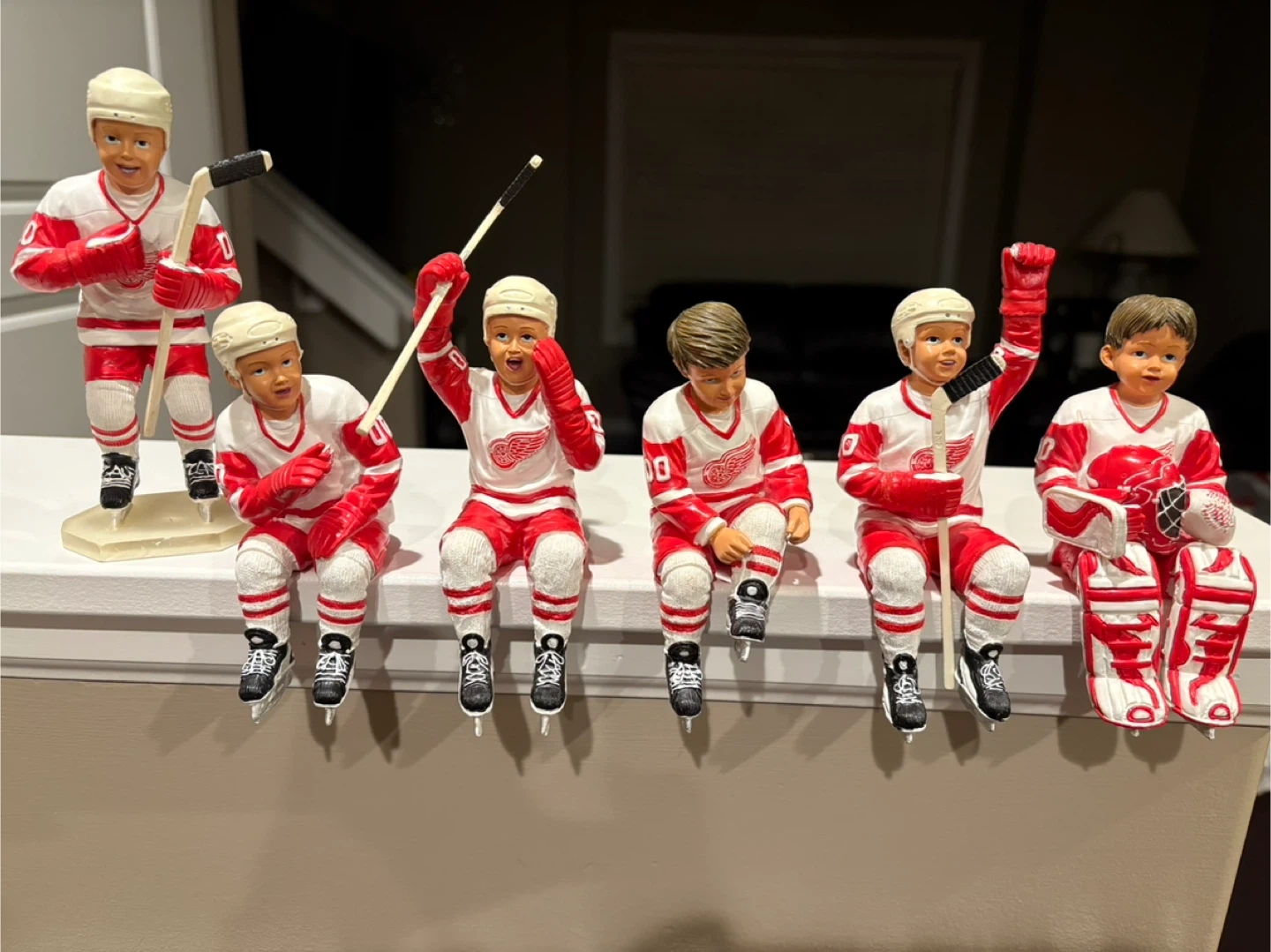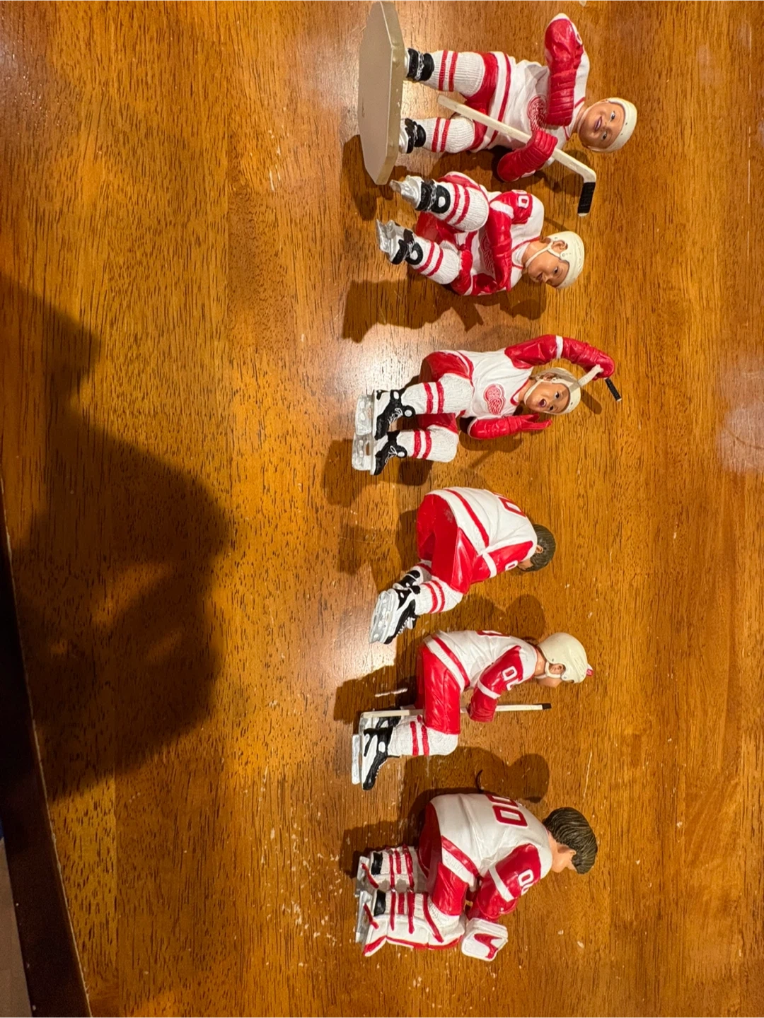 This set includes six collectible figurines of hockey players in Detroit Red Wings uniforms. Each player is presented in a unique pose, some with hockey sticks and goalie pads. They're perfect for any dedicated fan's collection or display. Smoke free and pet free environment.