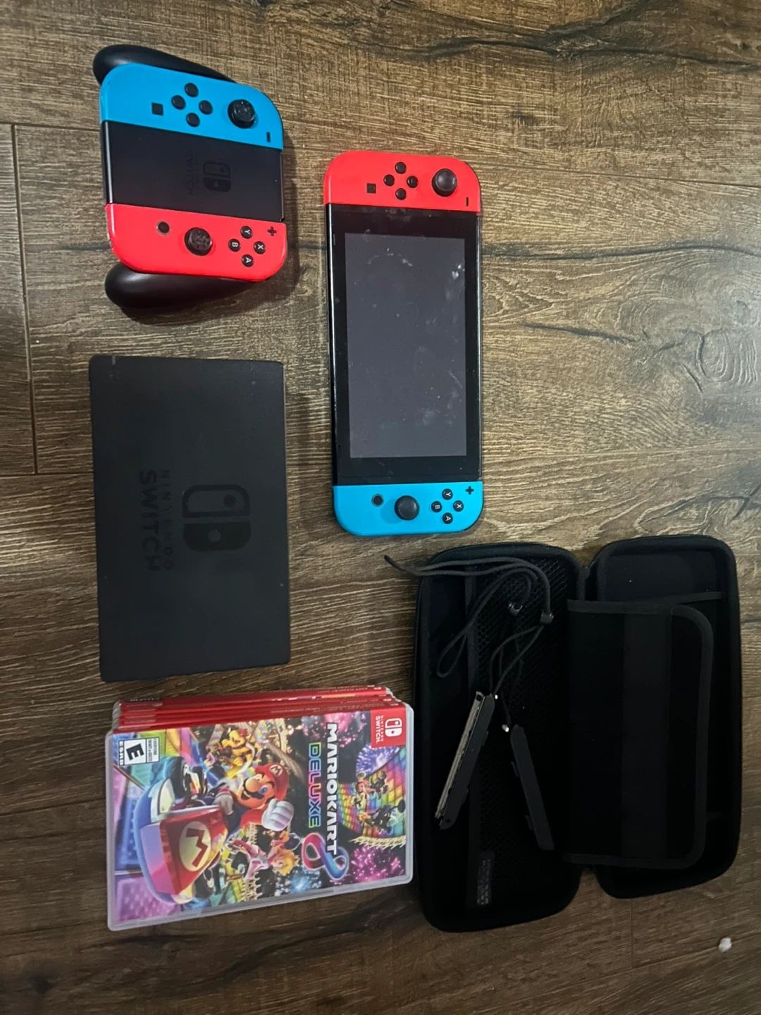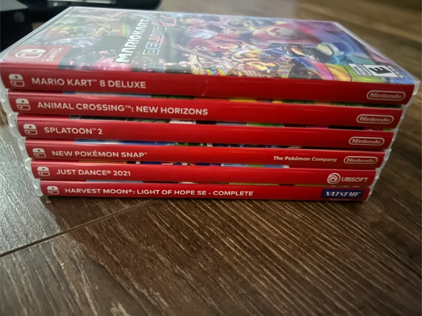 Nintendo Switch console with Joy-Cons, dock, and carrying case included. Comes with multiple games: Mario Kart 8 Deluxe, Animal Crossing: New Horizons, Splatoon 2, New Pokémon Snap, Just Dance 2021, and Harvest Moon: Light of Hope SE - Complete. This bundle is ready for gaming fun!