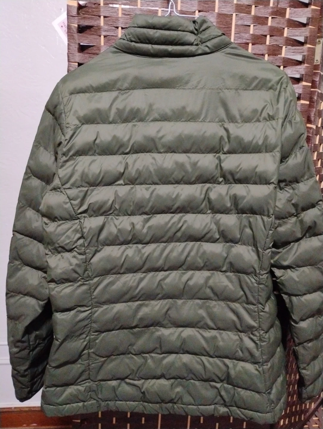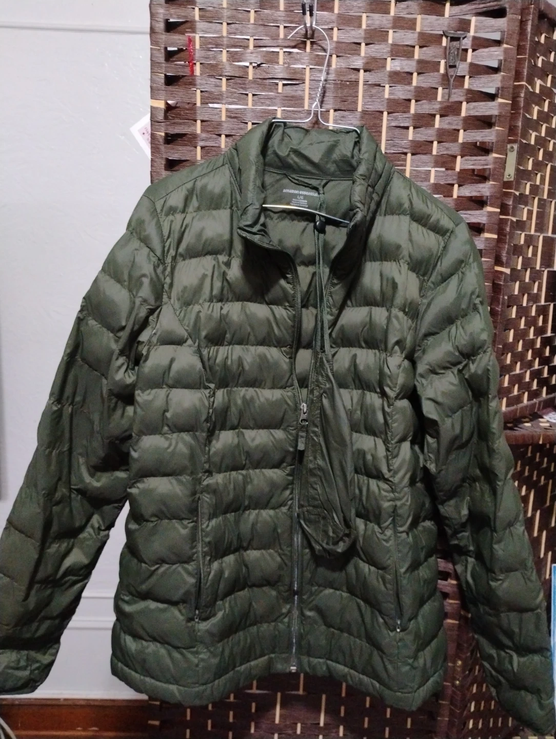This is an Amazon Essentials puffer jacket in olive green. It's a lightweight and packable outerwear option. The jacket has a full zip front and zippered pockets. It's made of polyester.
