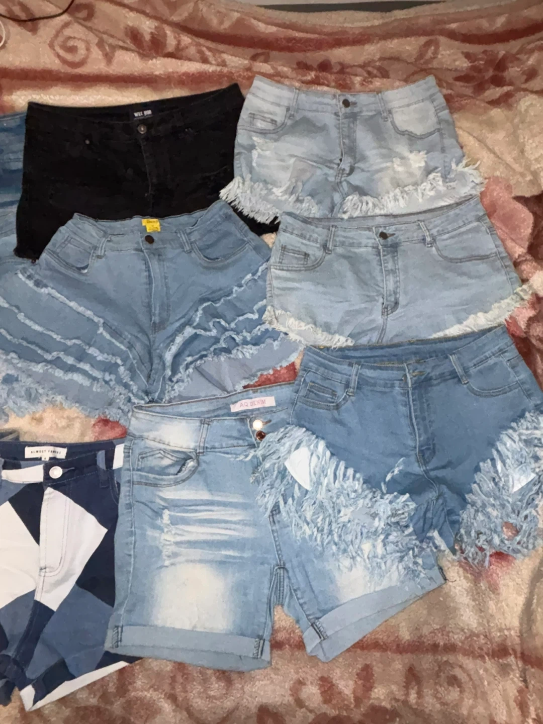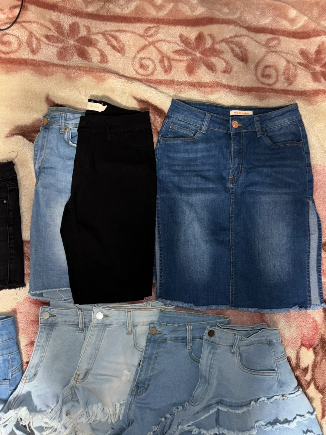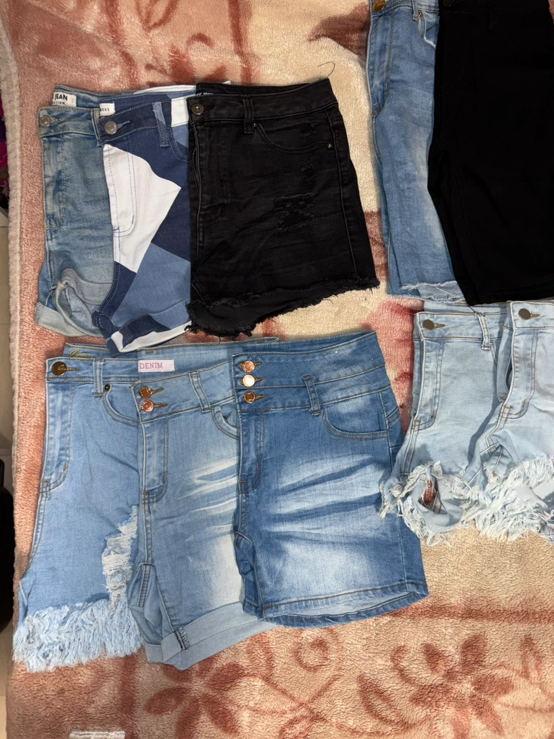 Bundle of various denim shorts, including distressed styles, fringe details, and a geometric print and one skirt with to slits on the side. Mostly light to medium wash denim. These shorts are perfect for casual wear during warmer weather! Sizes are 9, 11 and Large. If you’re only interested in one or a few please let me know.