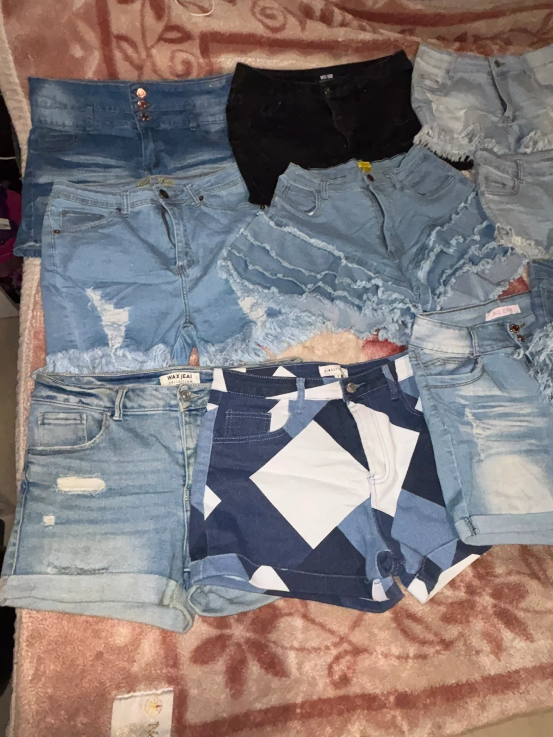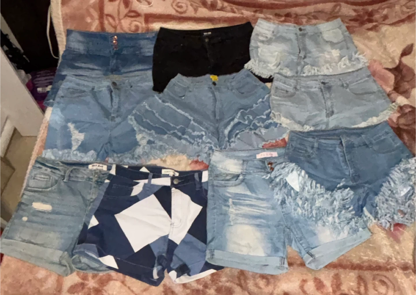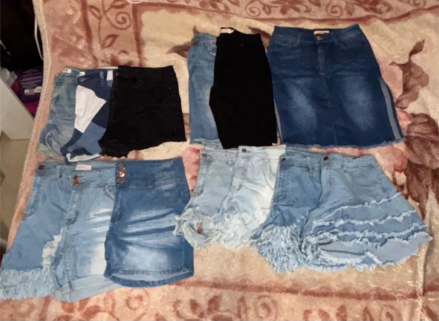 Bundle of various denim shorts, including distressed styles, fringe details, and a geometric print and one skirt with to slits on the side. Mostly light to medium wash denim. These shorts are perfect for casual wear during warmer weather! Sizes are 9, 11 and Large. If you’re only interested in one or a few please let me know.
