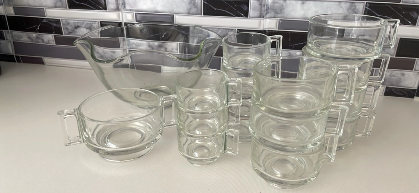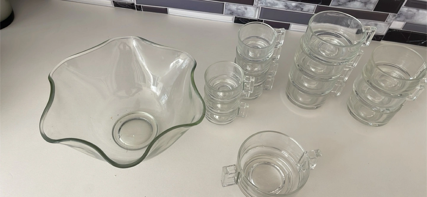 Selling a clear glass punch bowl set, complete with matching cups! It's a lovely set for entertaining or adding a touch of elegance to your kitchen. Perfect for parties or special occasions!