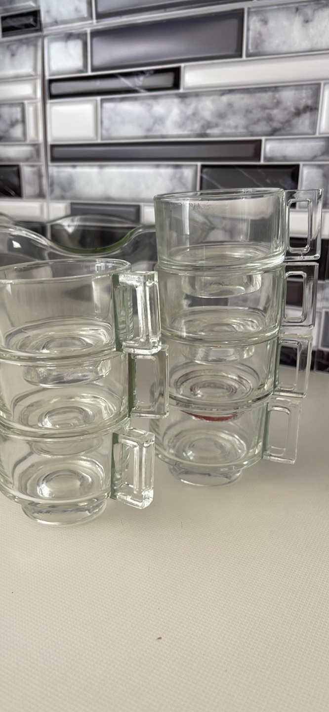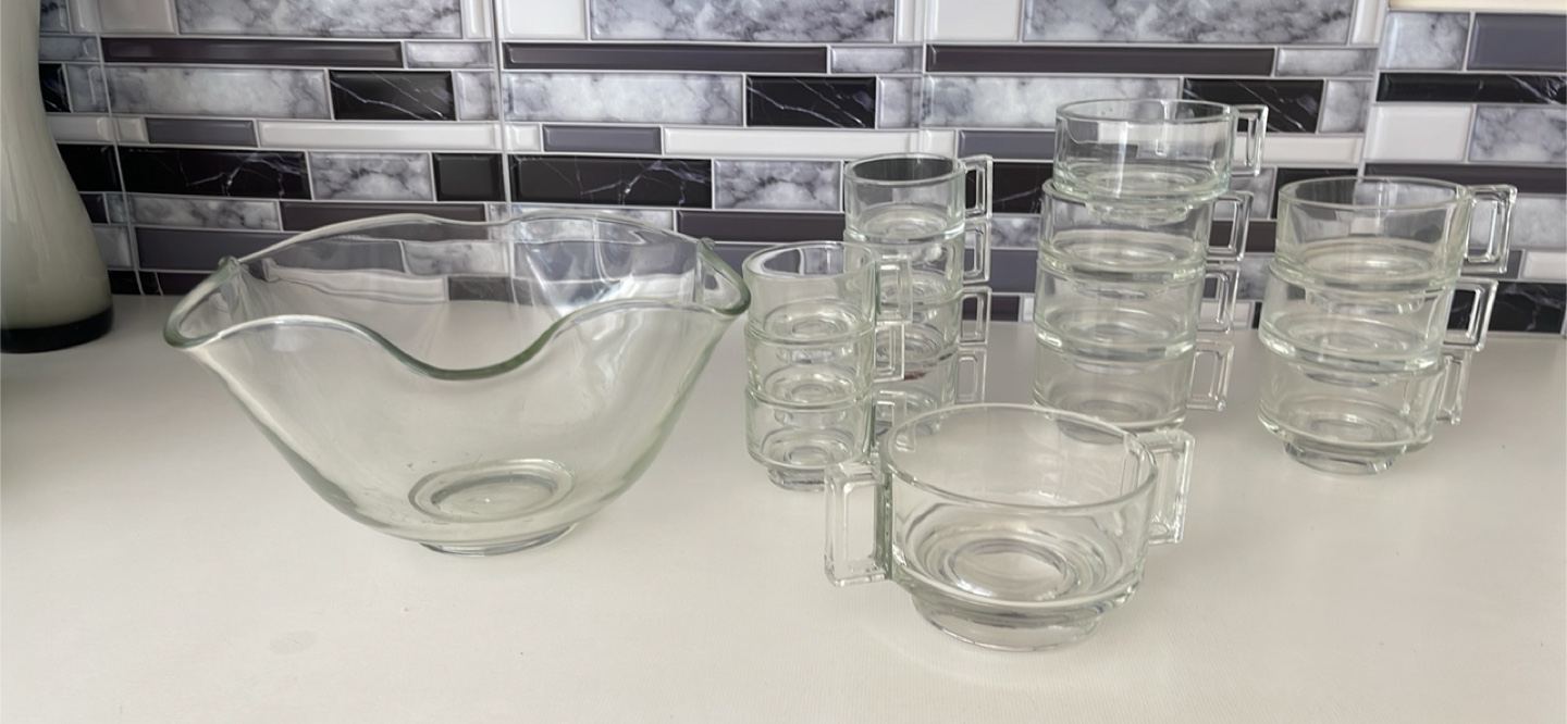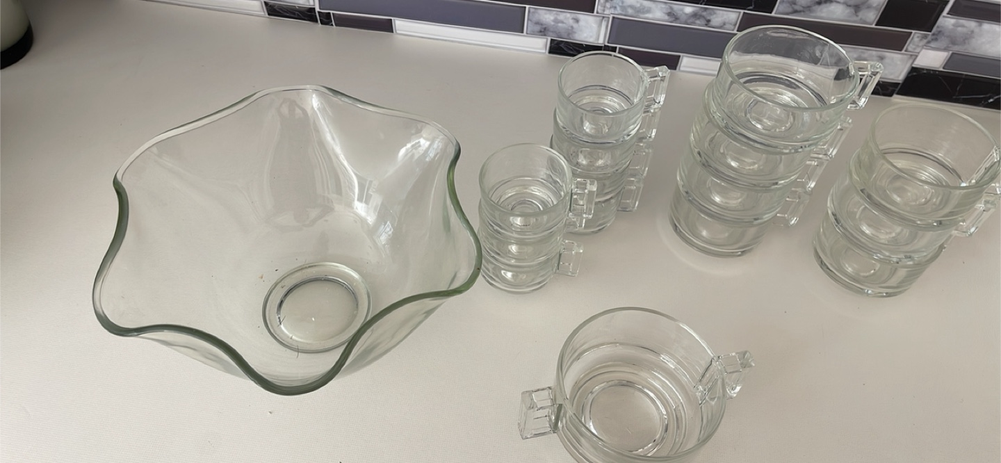 Selling a clear glass punch bowl set, complete with matching cups! It's a lovely set for entertaining or adding a touch of elegance to your kitchen. Perfect for parties or special occasions!