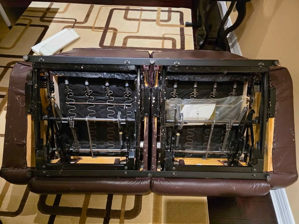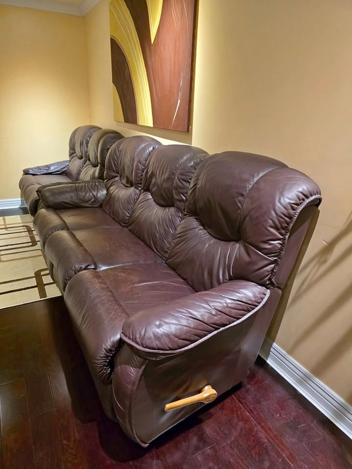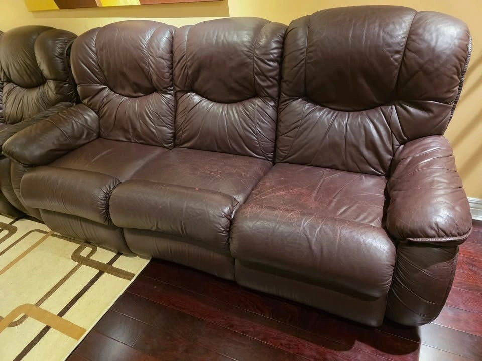 Genuine leather all around, no vinyl. The loveseat is sold. The sofa recliners and coffee table set is currently disassembled into 6 pieces and 2 rails, making it very easy to transport and potentially fit in a minivan or mid/full-size SUV. You can move and assemble it with ease. Please see pictures for condition; other than cosmetic wear, everything works perfectly. There are 2 recliner seats in total. The set is disassembled for storage.
