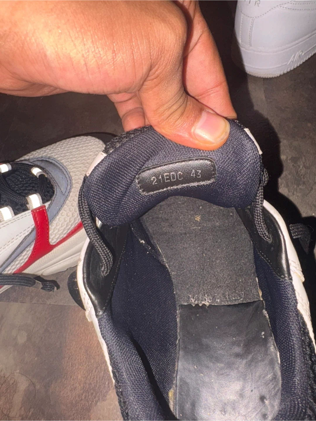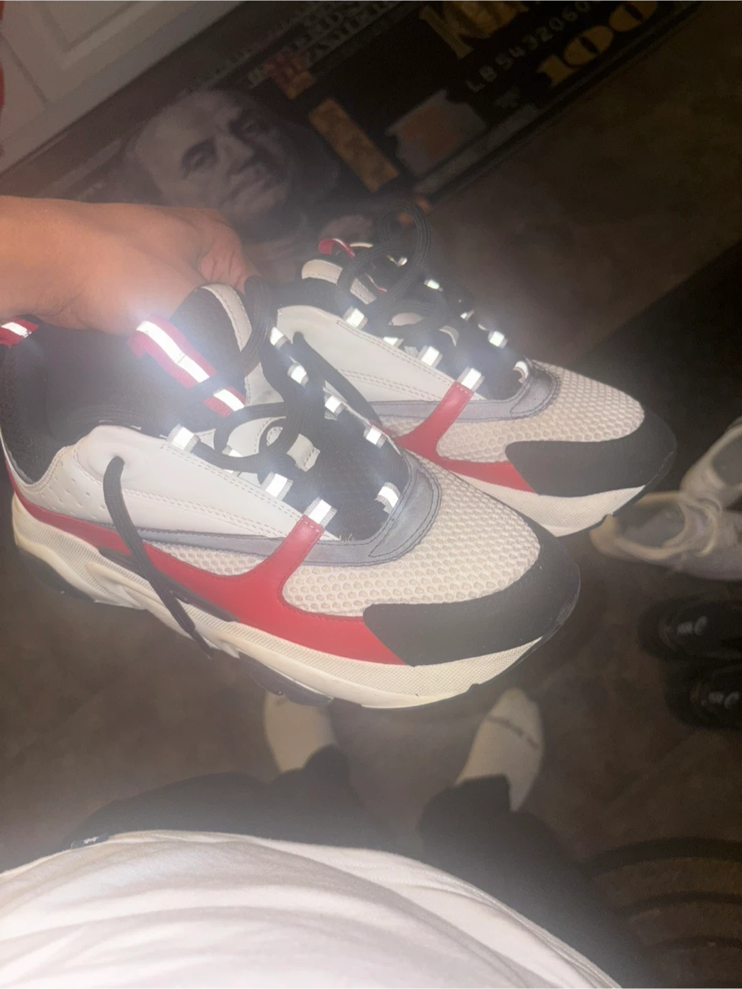Authentic Dior B22 sneakers in size 43. These stylish running shoes feature a white, black, and red colourway with mesh and leather accents. They're perfect for a sporty or casual look.