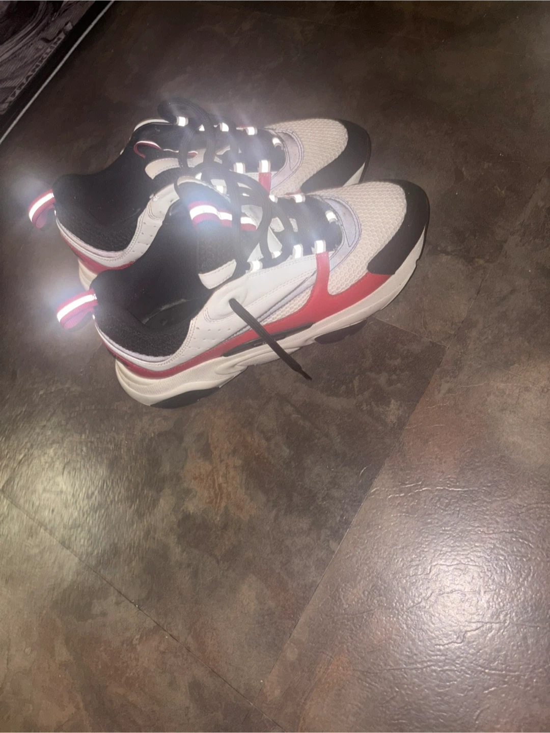Authentic Dior B22 sneakers in size 43. These stylish running shoes feature a white, black, and red colourway with mesh and leather accents. They're perfect for a sporty or casual look.