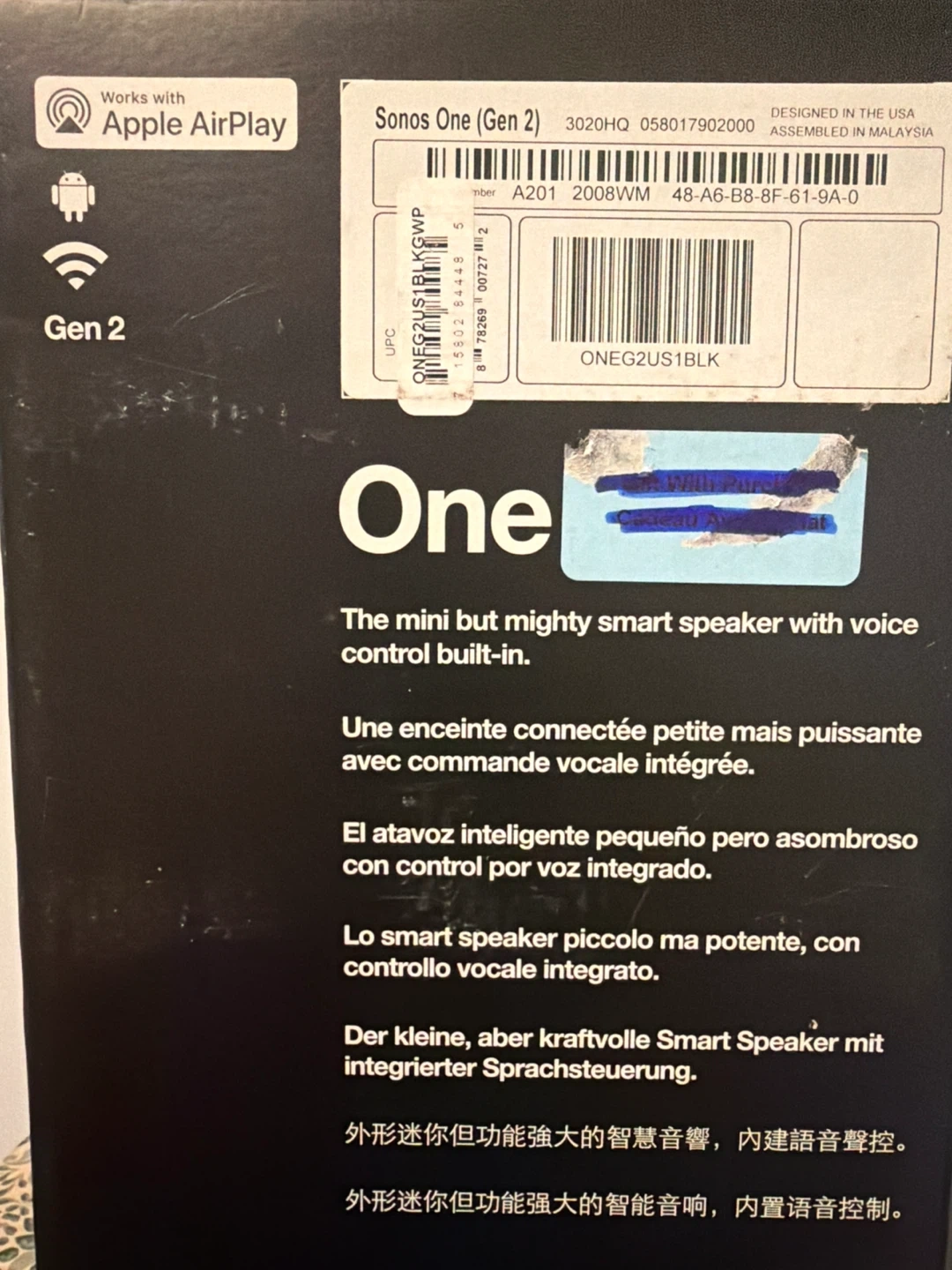 Selling a Sonos One (Gen 2) smart speaker in black. It's the mini but mighty smart speaker with voice control built-in. Works with Apple AirPlay. The box is included!