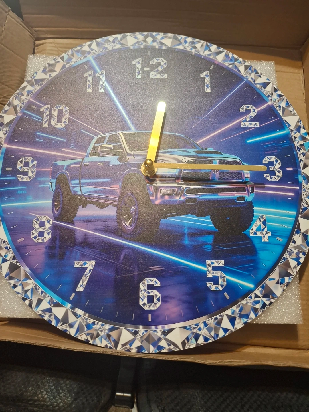 Cool wall clock featuring a Ram truck. It's got a diamond-patterned border. This clock would look great in a garage or man cave!