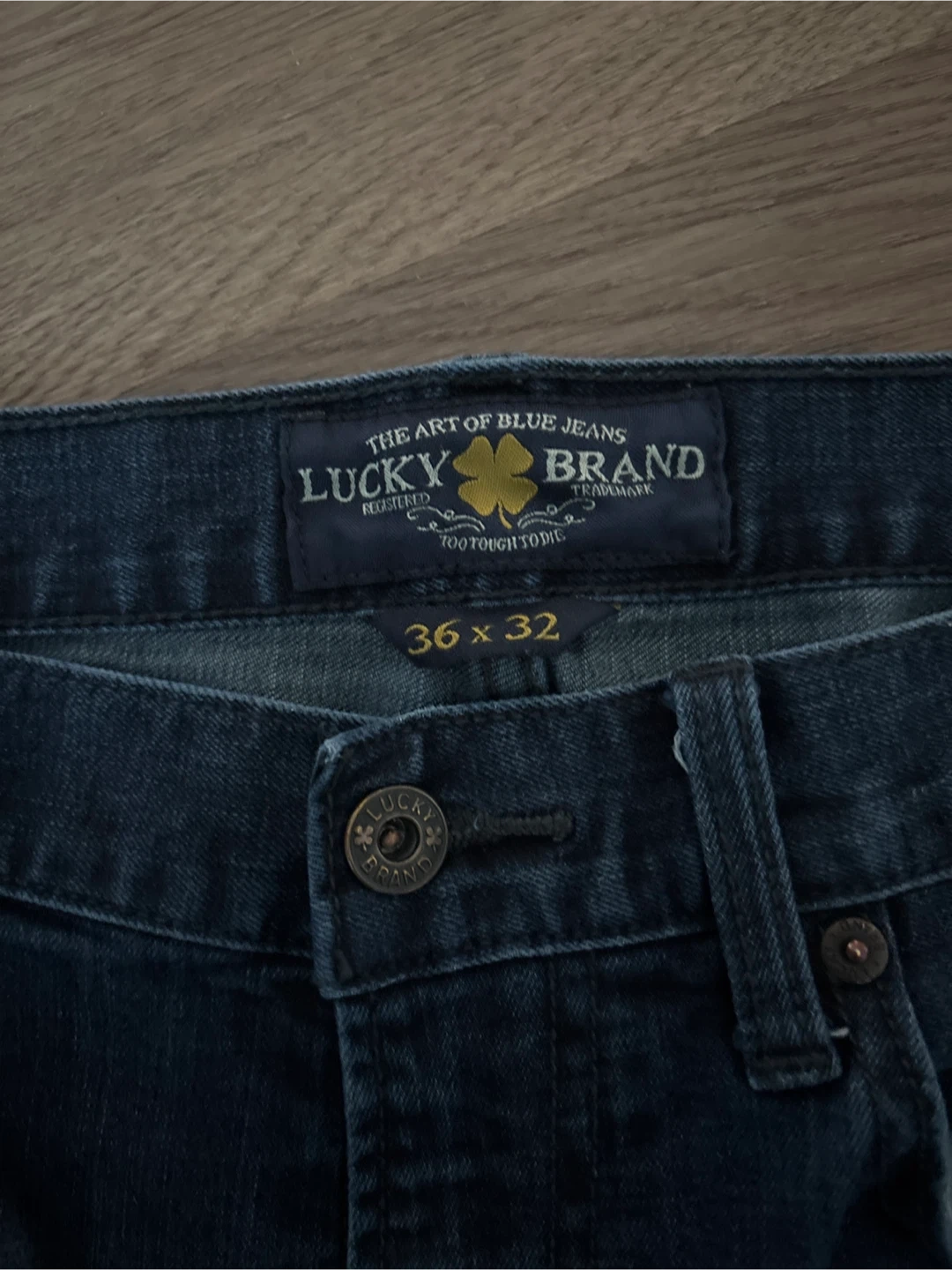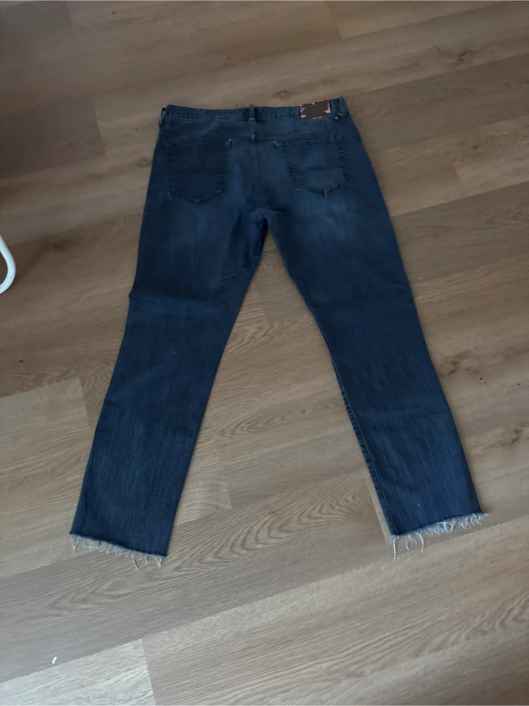 Classic blue denim jeans with a relaxed fit. These jeans have a distressed hemline and a medium wash. They're made from durable denim fabric.