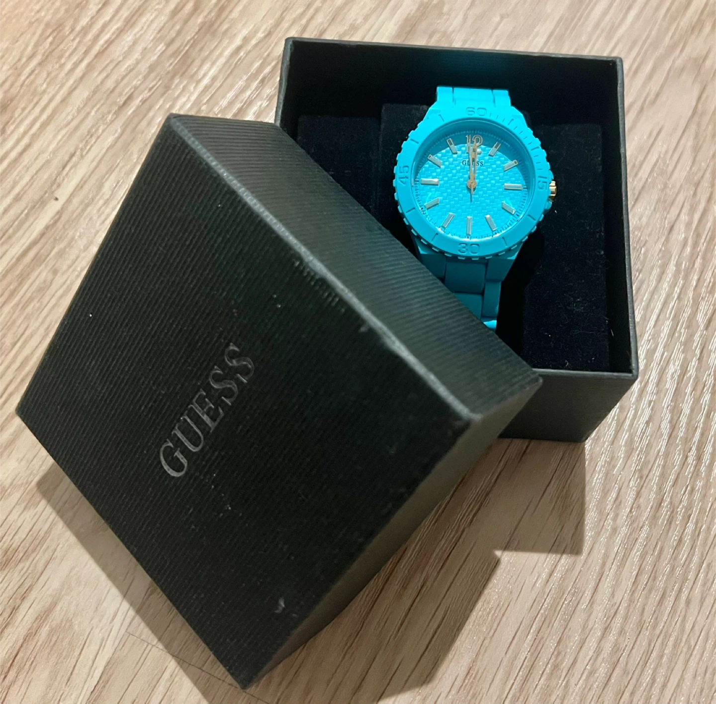 Selling a stylish Guess watch in a vibrant aqua blue colour. It comes with its original box, making it perfect for gifting or keeping it safe when not in use.