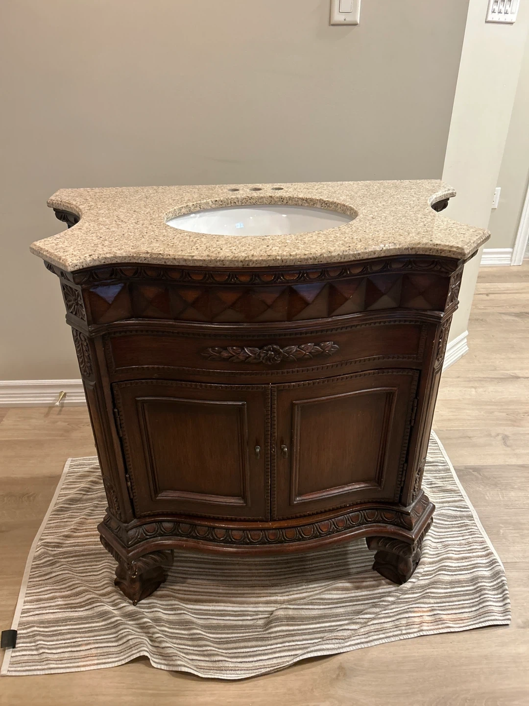 Beautifully crafted dark wood vanity featuring intricate carved details. It comes with a granite countertop and a white ceramic sink. The cabinet doors open to reveal storage space.