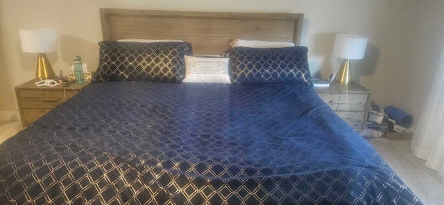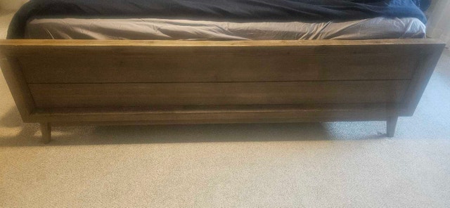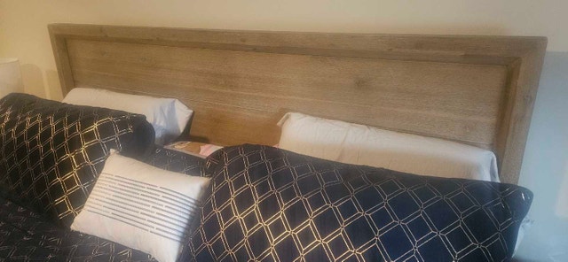 Structube king bed and a Logan & Cove mattress. Paid $2400. Selling because we bought a split mattress and a adjustable base. Non smoking pet free home. Bed will be dissembled, all hardware included. Yes its still available. No I wont hold it. No I wont deliver it. No I wont help load it. Price is firm. Cash only. Located just off Wye Road.