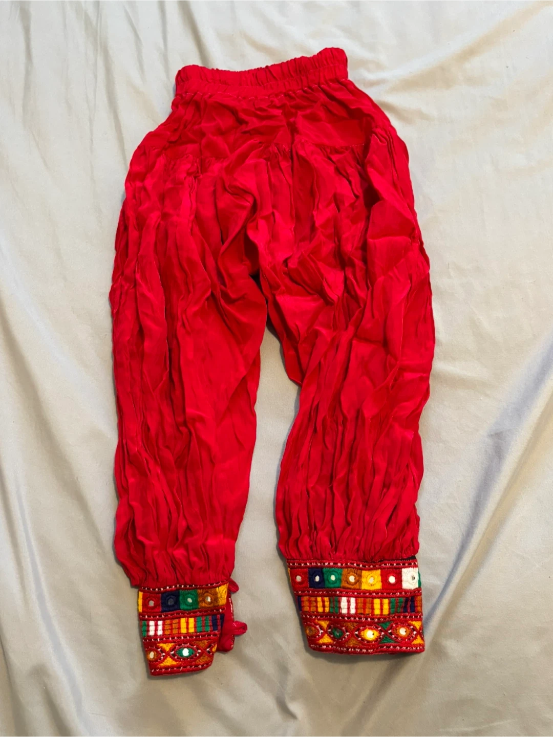 Beautiful red Afghan dress with matching pants and scarf for kids! The dress and pants feature intricate embroidery and embellishments. Perfect for cultural events or special occasions. The set includes a dress, pants, and a scarf.
