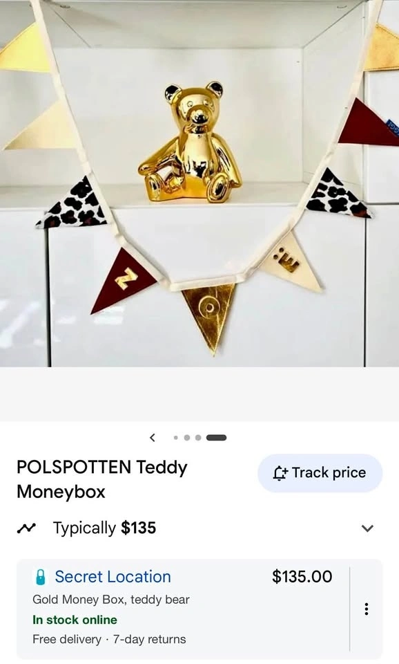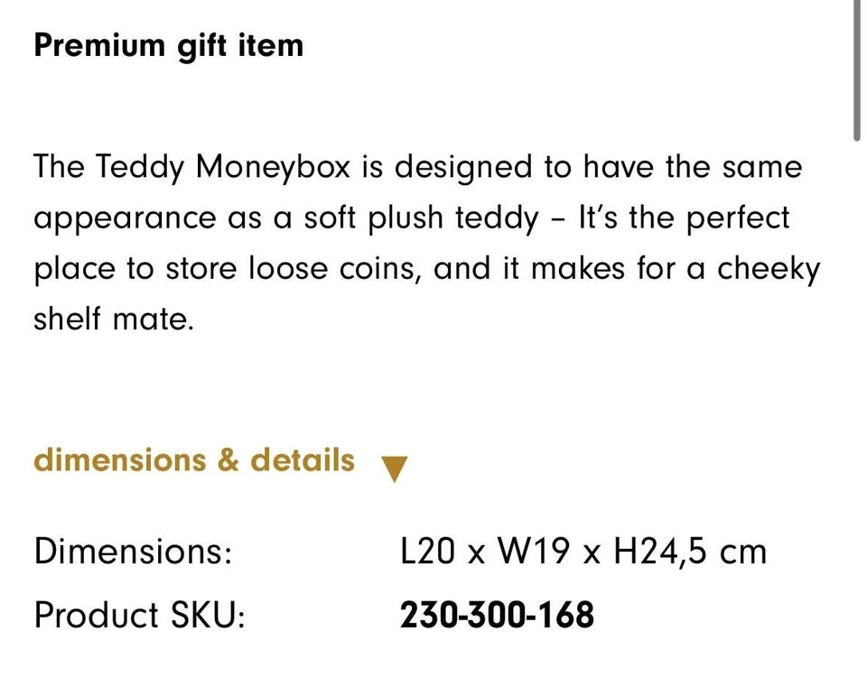 Buy & SellGold Teddy Bear MoneybankGold Teddy Bear Moneybank$60In box, new and never opened. Pick up only in RDP.WHERE TO MEETCheck LocationView MapSELLERverifiedAlexiaRivière-des-Prairies Ouest650 reviews0 chats·0 favorites·2 viewsSEND CHAT TO SELLERHi Alexia! I’m interested in your listing.Hi Alexia! I’m interested in your listing.Get the Karrot app to chatSign In to chat