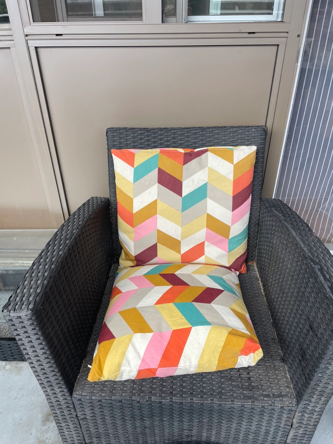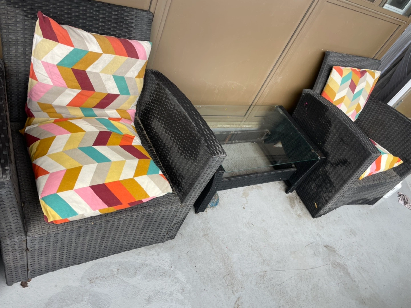 Four-piece patio set. Two armchairs, couch and a small glass-top table. Black wicker furniture. Multicoloured ikea cushions included.