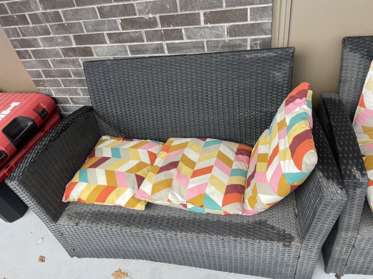 Four-piece patio set. Two armchairs, couch and a small glass-top table. Black wicker furniture. Multicoloured ikea cushions included.