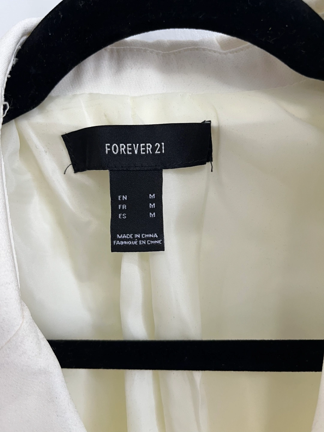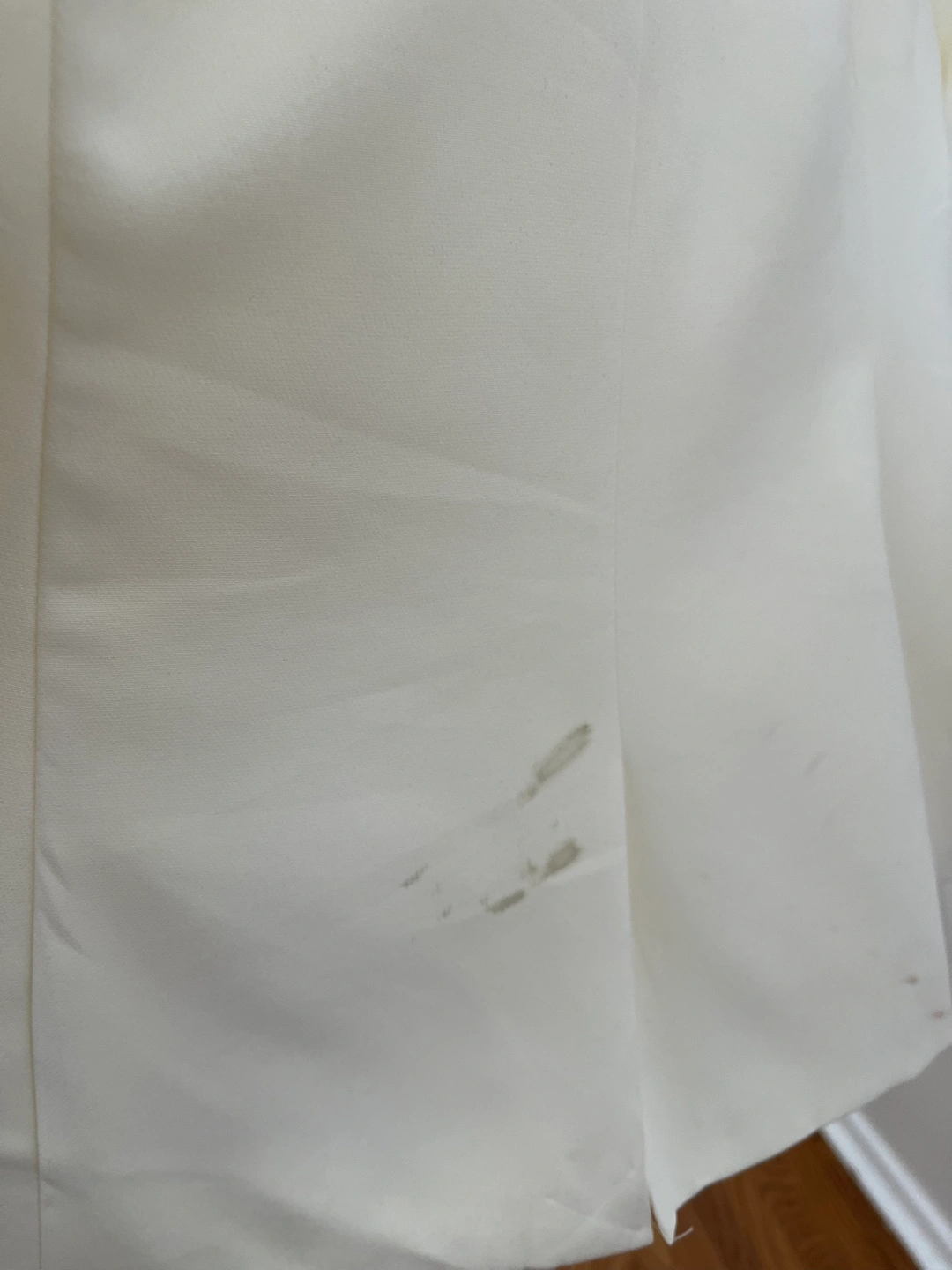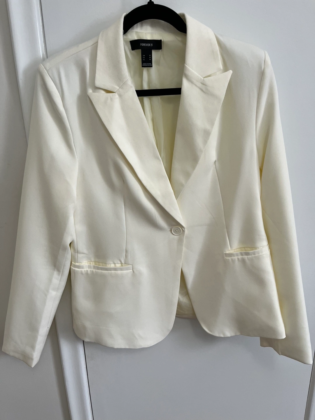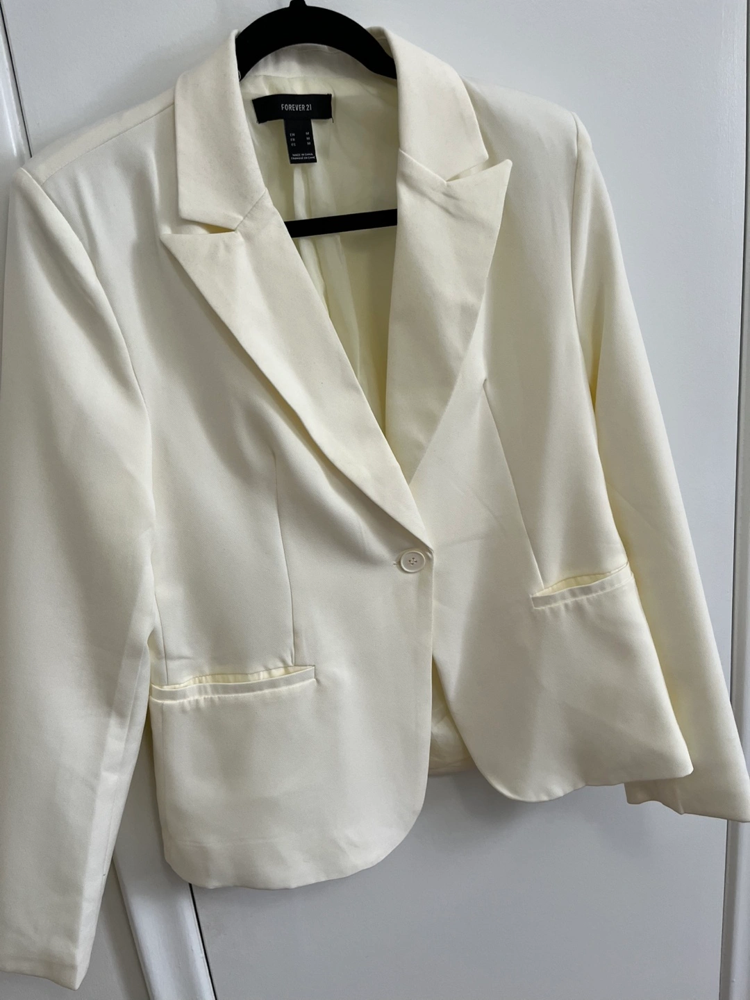 Cream-coloured blazer. Single button closure. Long sleeves. Two pockets. Minor stains that can be removed by washed. I never washed it and just worn twice.