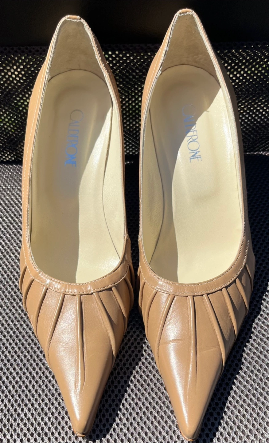 Made in Italy, a beautiful classic pair of hard to find patent leather Calderone heels in a smooth caramel colour. 2.5 inches high and size 7.5, they’re so new that the heel shows almost no signs of wear.