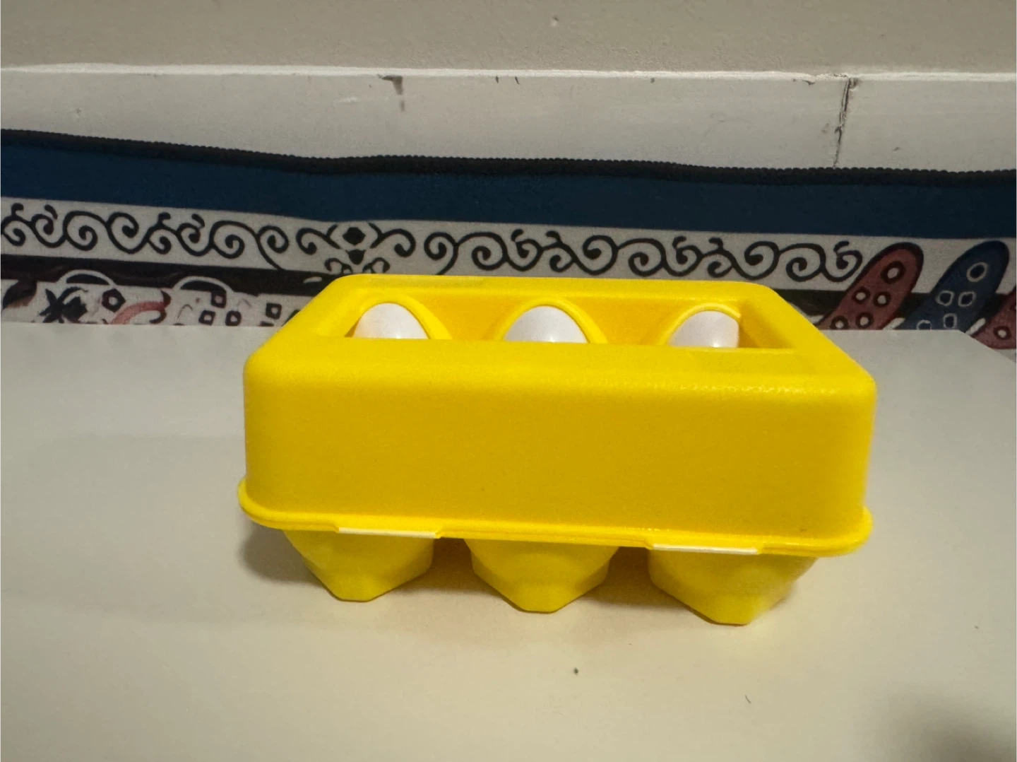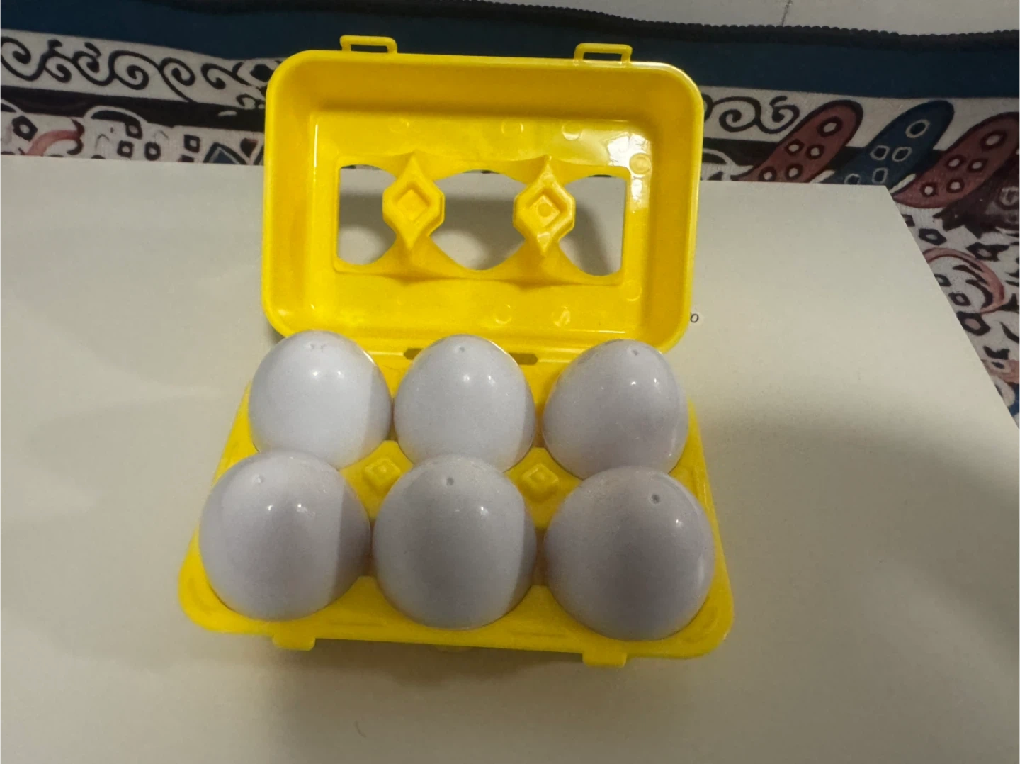This toy egg carton comes with six white eggs. Some of the eggs have red bases inside, and one egg is shown disassembled. Made of plastic.