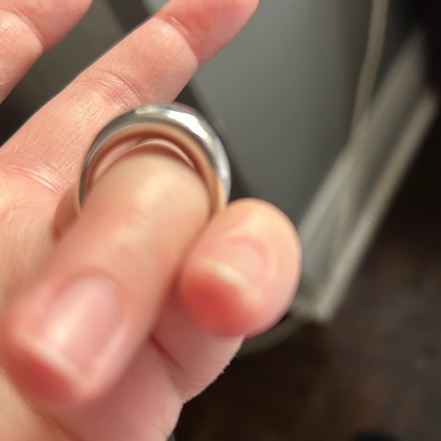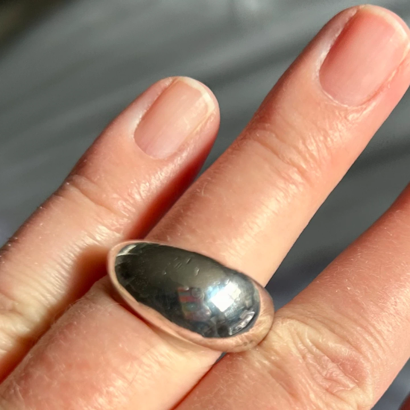 A classic silver band ring. It's a US size 7. Made of polished silver. From Pandora’s liquid silver collection.