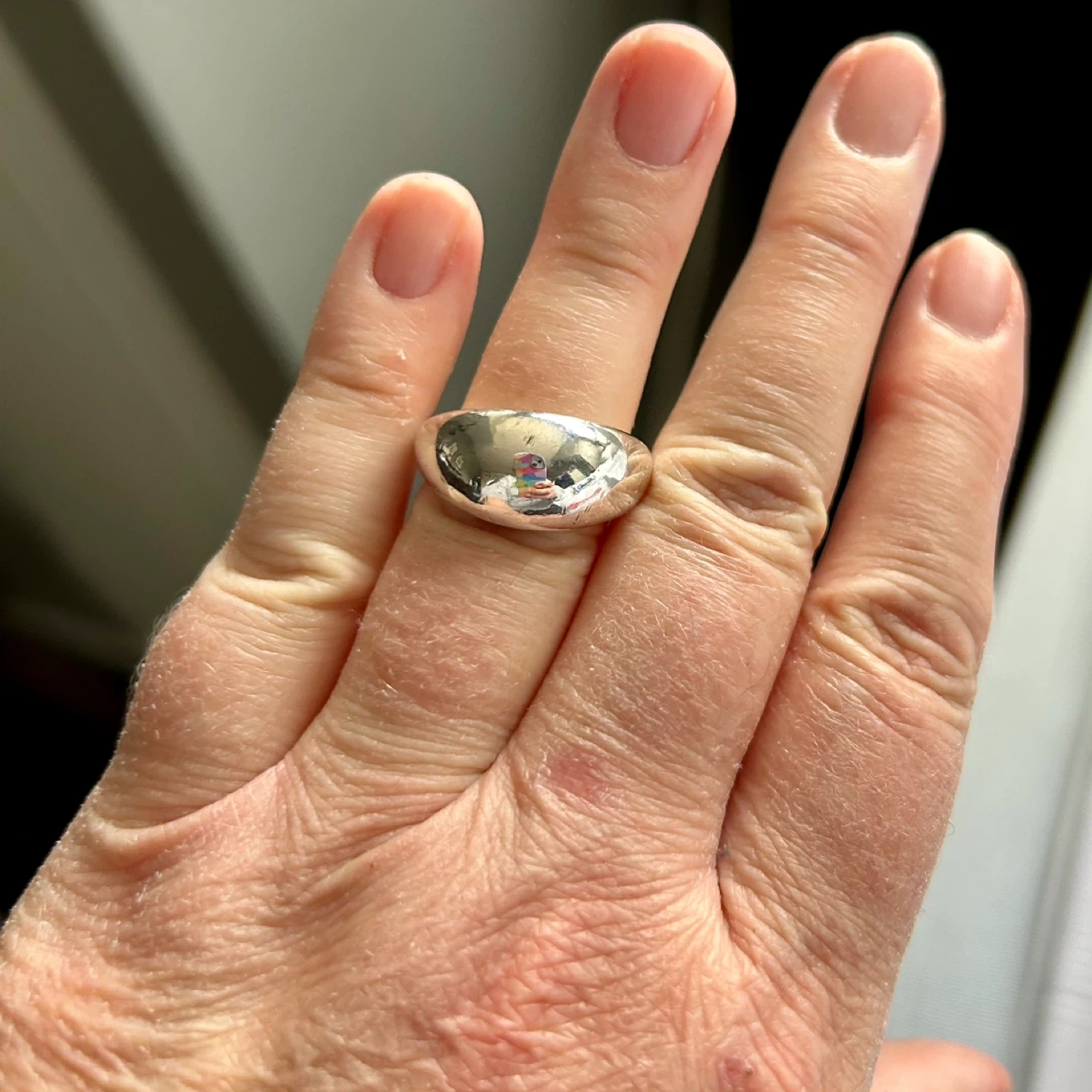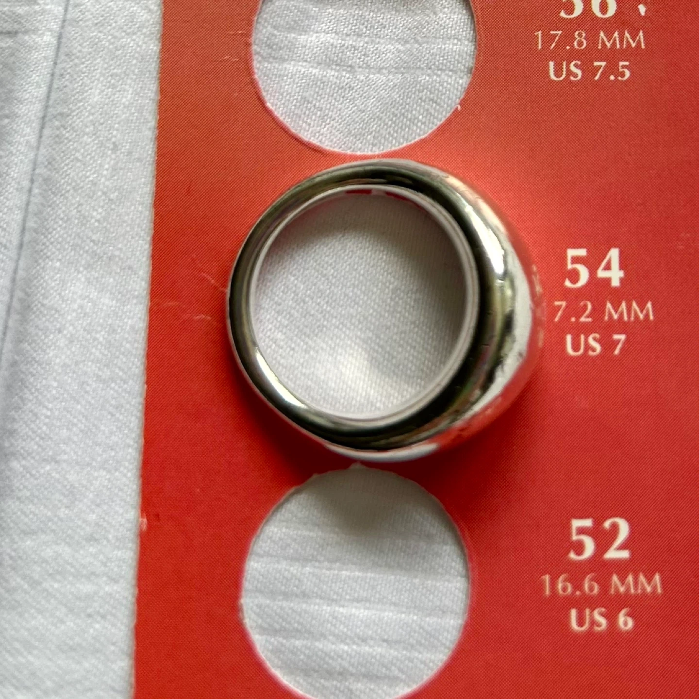 A classic silver band ring. It's a US size 7. Made of polished silver. From Pandora’s liquid silver collection.