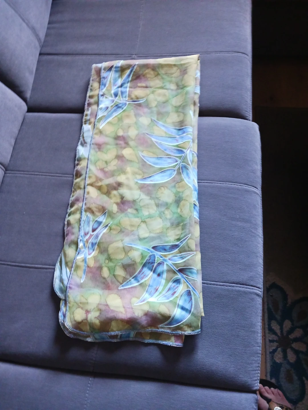 A lightweight scarf featuring a batik-style print with blue leaves on a mottled brown, green, and yellow background. It's finished with a blue stitched hem. This accessory would add a pop of colour to any outfit!
