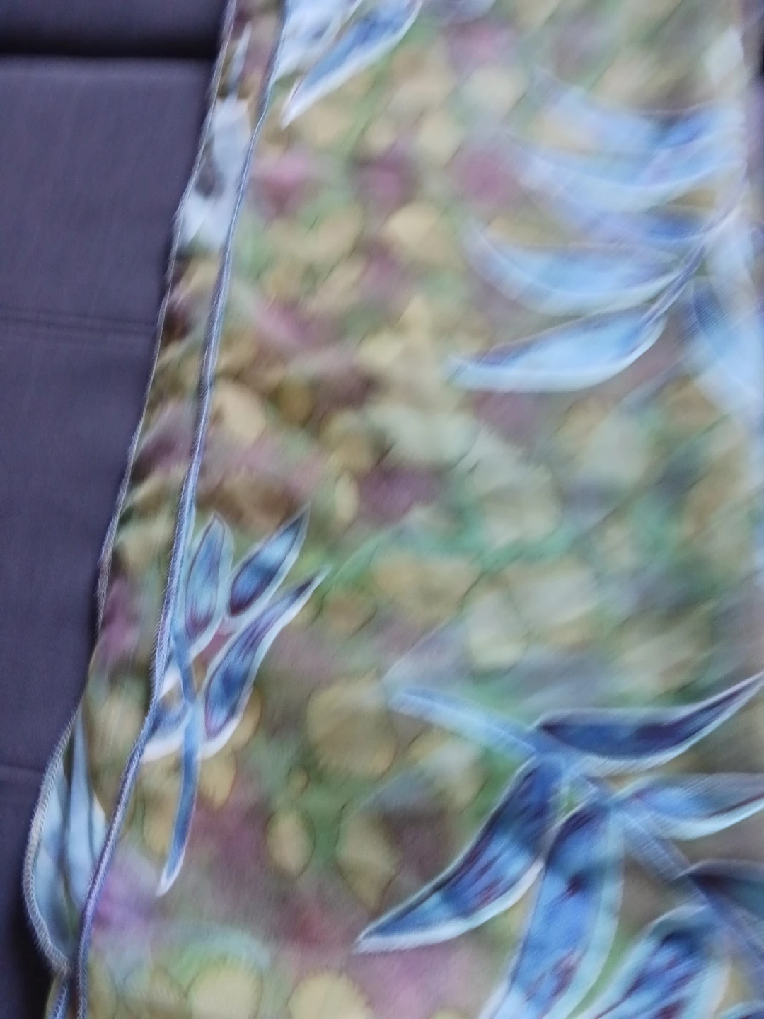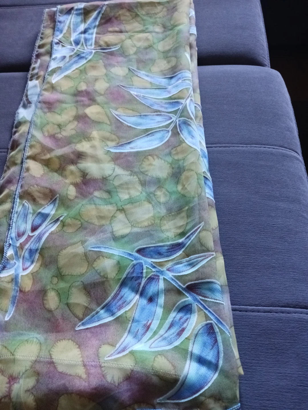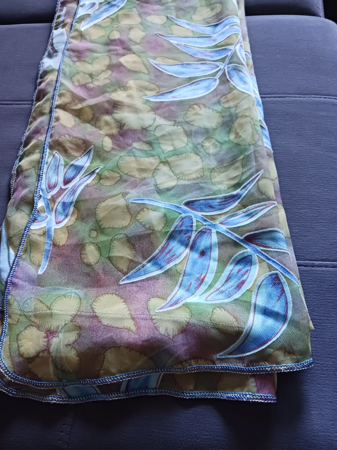 A lightweight scarf featuring a batik-style print with blue leaves on a mottled brown, green, and yellow background. It's finished with a blue stitched hem. This accessory would add a pop of colour to any outfit!